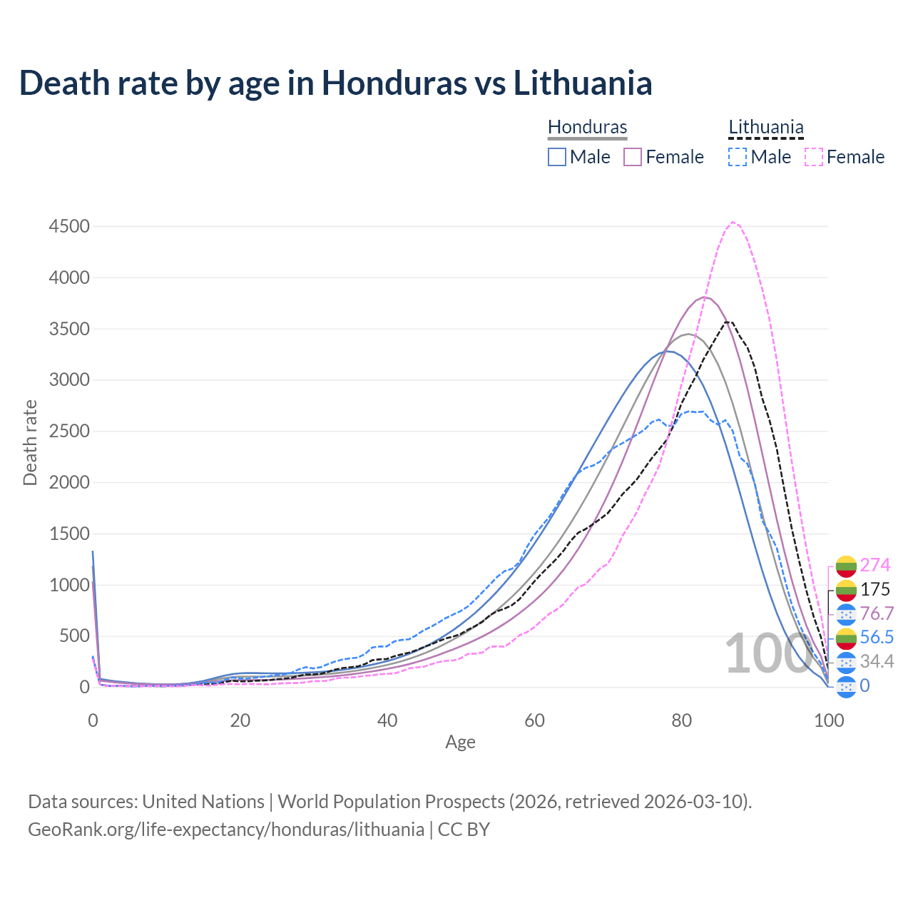 In Honduras, the most common age of death is 81, compared to 86 in Lithuania. The median age of death is 77.1 in Honduras and 80.4 in Lithuania, meaning only half of each cohort is expected to live past that age.