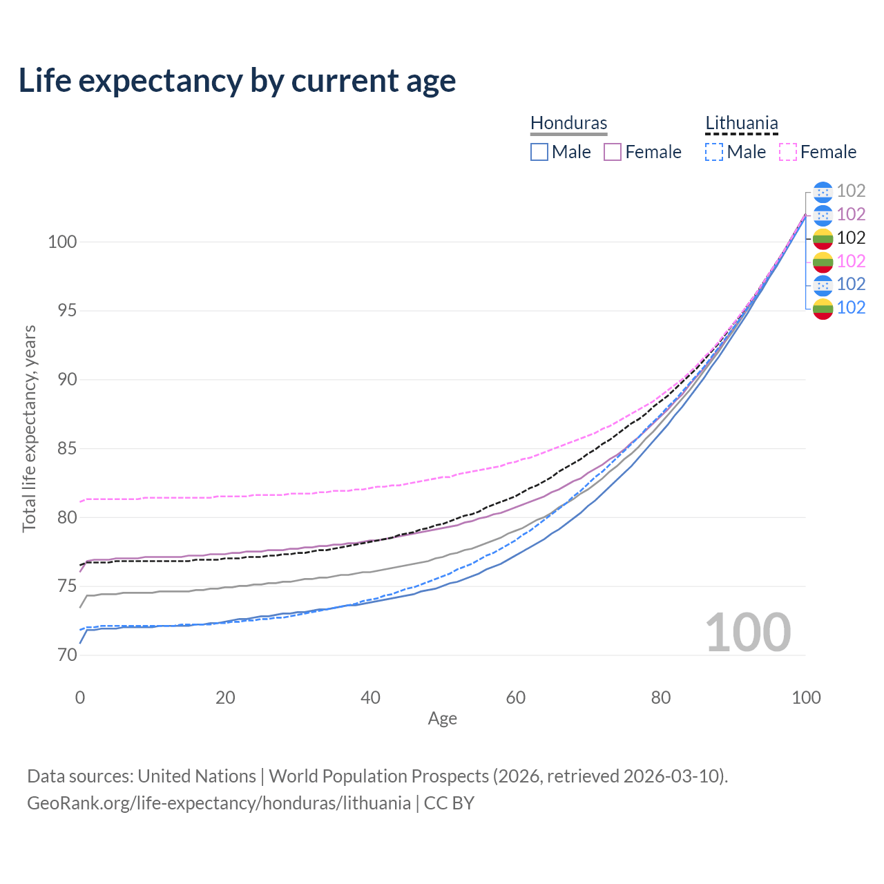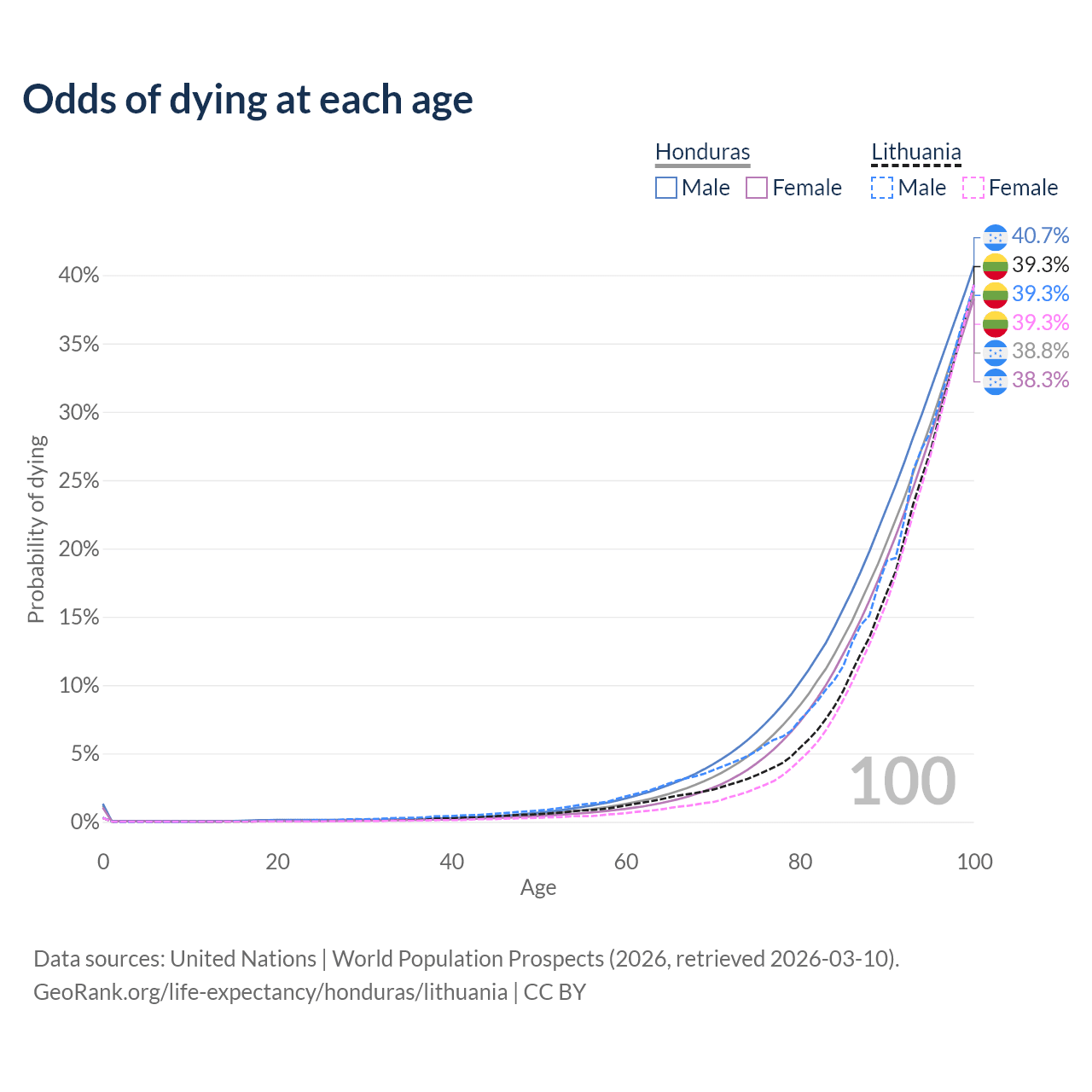 This life expectancy calculator shows the odds of living to 100, 95, 90, and below based on current age for both males and females in Honduras and Lithuania, along with mean and median age of death. The calculations are based on the 2026 life tables (actuarial tables) from the UN World Population Prospects.