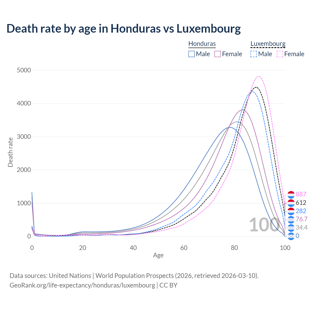 In Honduras, the most common age of death is 81, compared to 89 in Luxembourg. The median age of death is 77.1 in Honduras and 85.7 in Luxembourg, meaning only half of each cohort is expected to live past that age.
