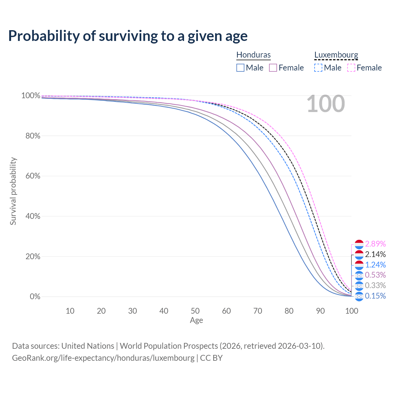 This life expectancy calculator shows the odds of living to 100, 95, 90, and below based on current age for both males and females in Honduras and Luxembourg, along with mean and median age of death. The calculations are based on the 2026 life tables (actuarial tables) from the UN World Population Prospects.