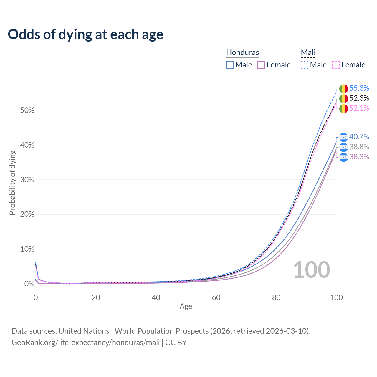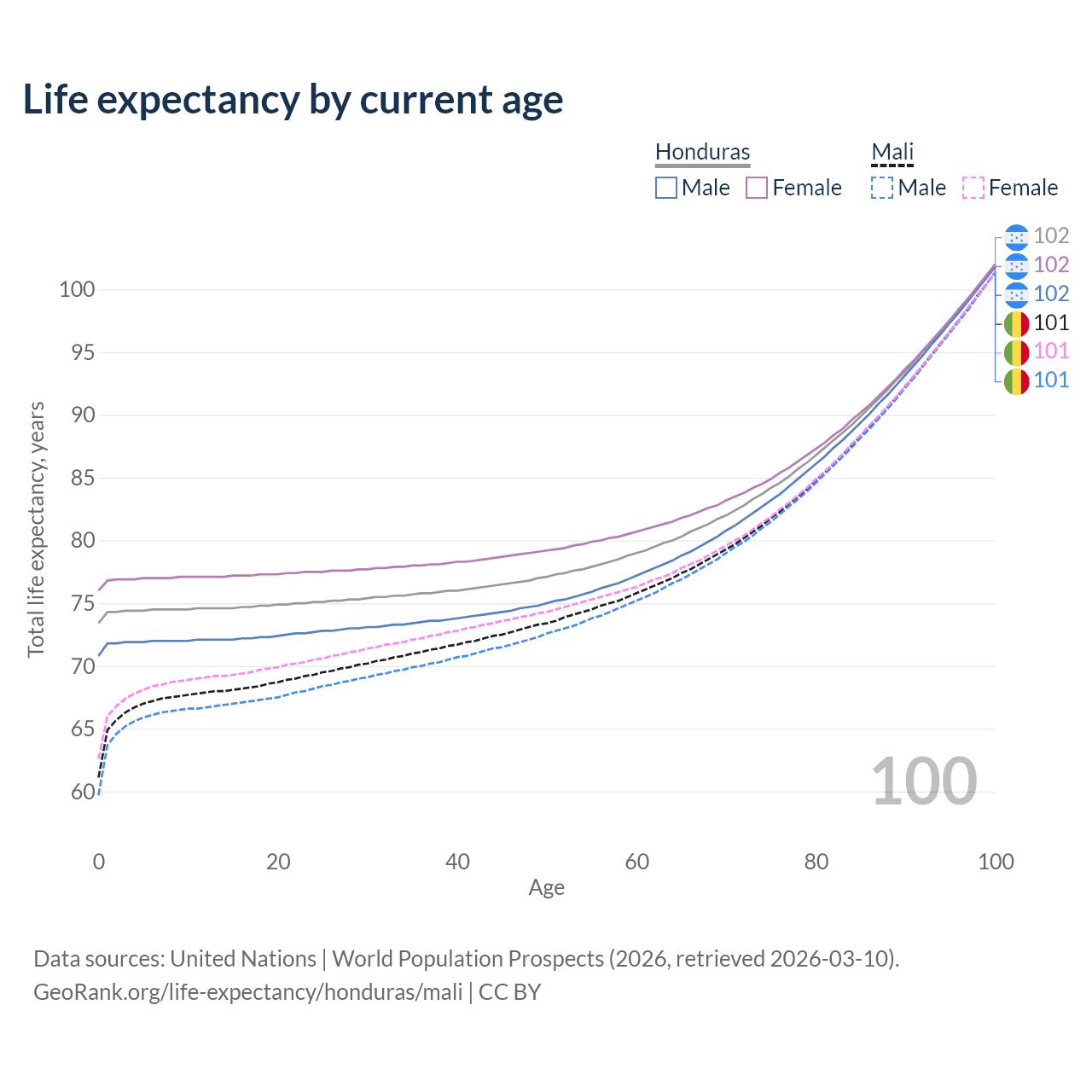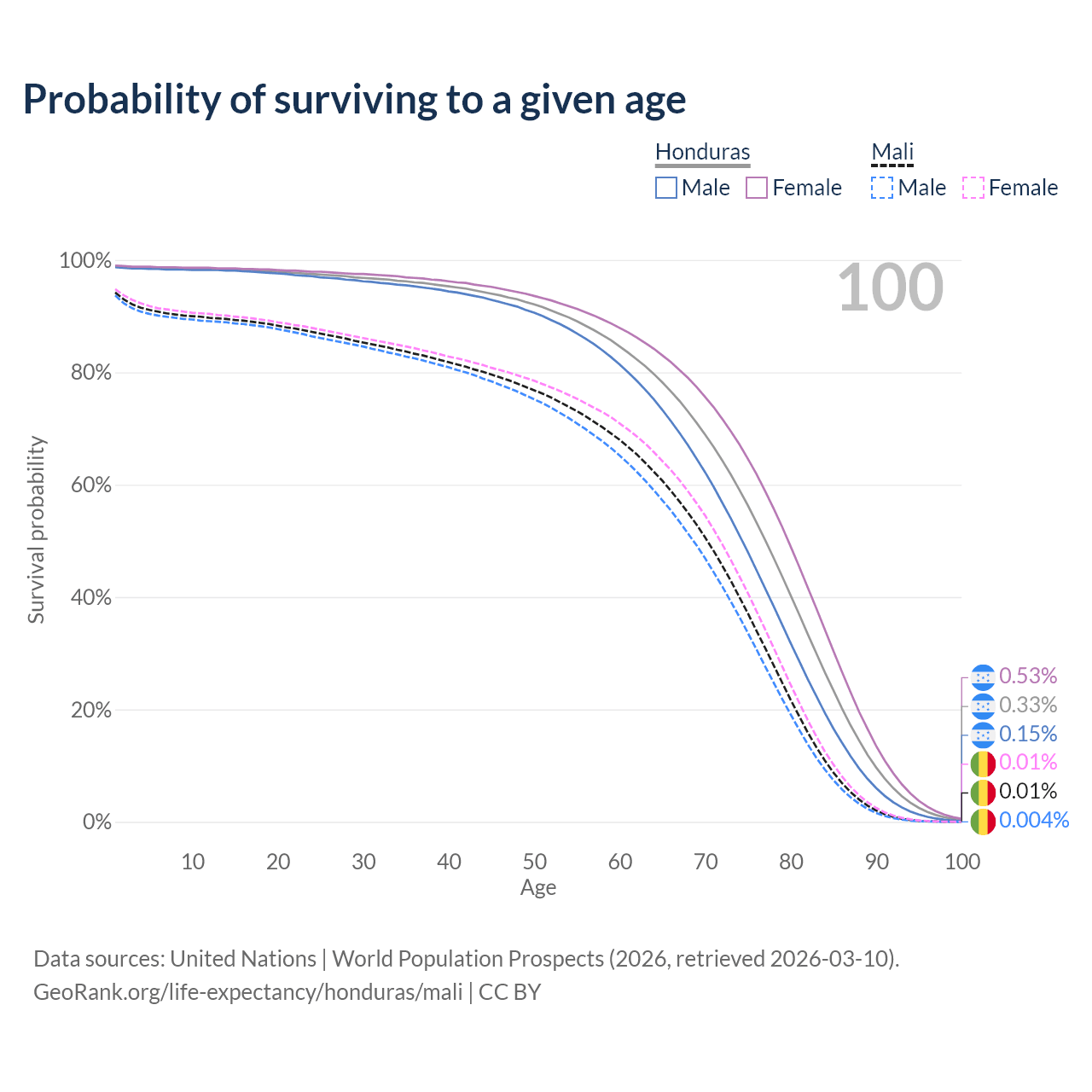This life expectancy calculator shows the odds of living to 100, 95, 90, and below based on current age for both males and females in Honduras and Mali, along with mean and median age of death. The calculations are based on the 2026 life tables (actuarial tables) from the UN World Population Prospects.
