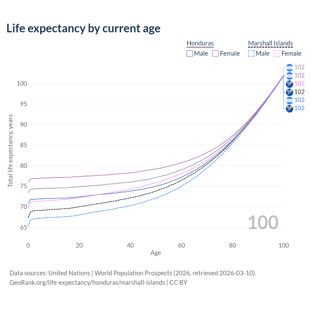 This life expectancy calculator shows the odds of living to 100, 95, 90, and below based on current age for both males and females in Honduras and the Marshall Islands, along with mean and median age of death. The calculations are based on the 2026 life tables (actuarial tables) from the UN World Population Prospects.