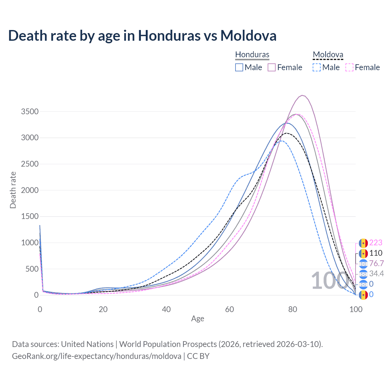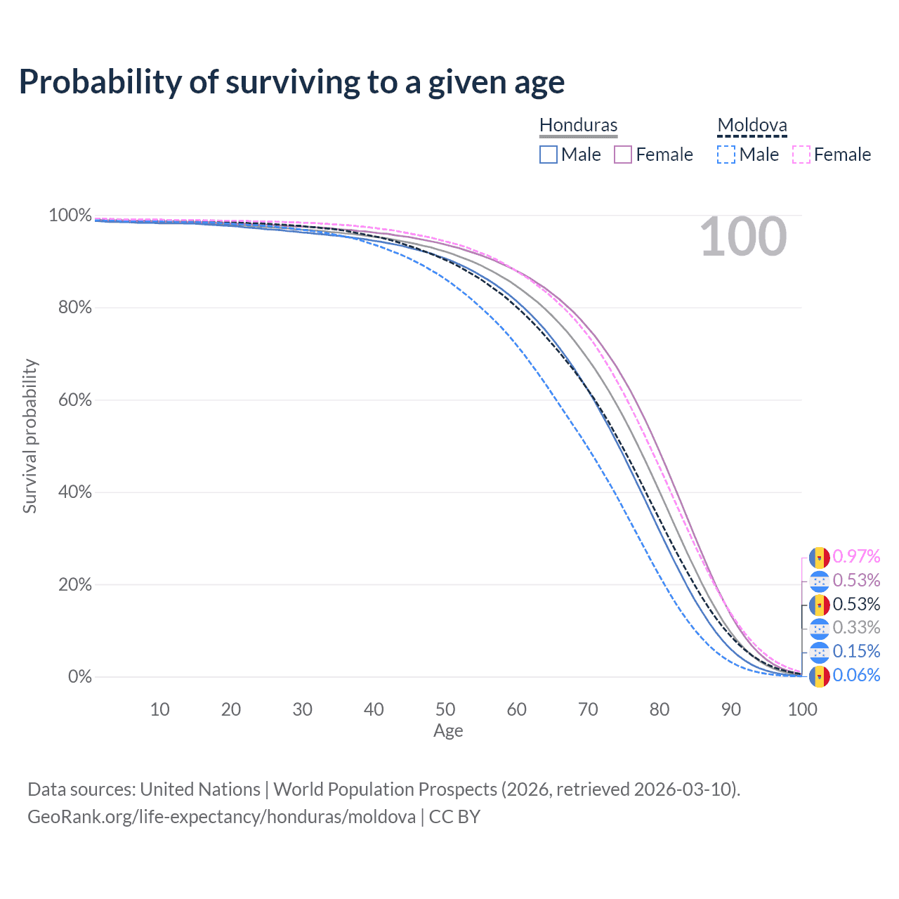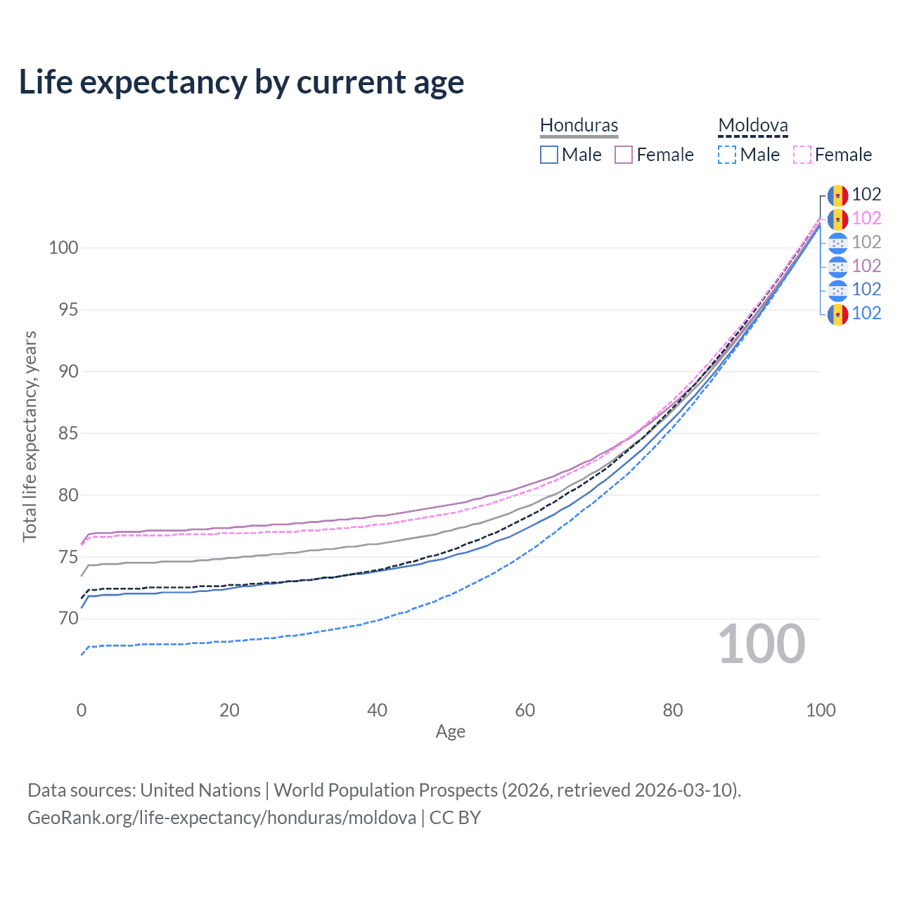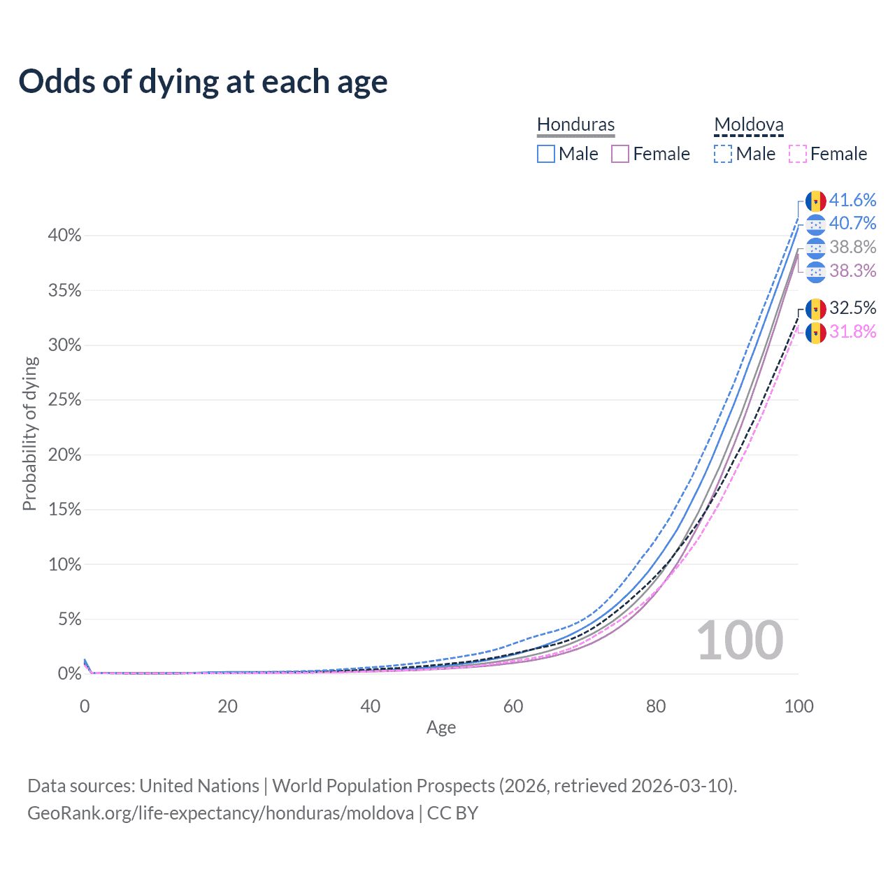 This life expectancy calculator shows the odds of living to 100, 95, 90, and below based on current age for both males and females in Honduras and Moldova, along with mean and median age of death. The calculations are based on the 2026 life tables (actuarial tables) from the UN World Population Prospects.
