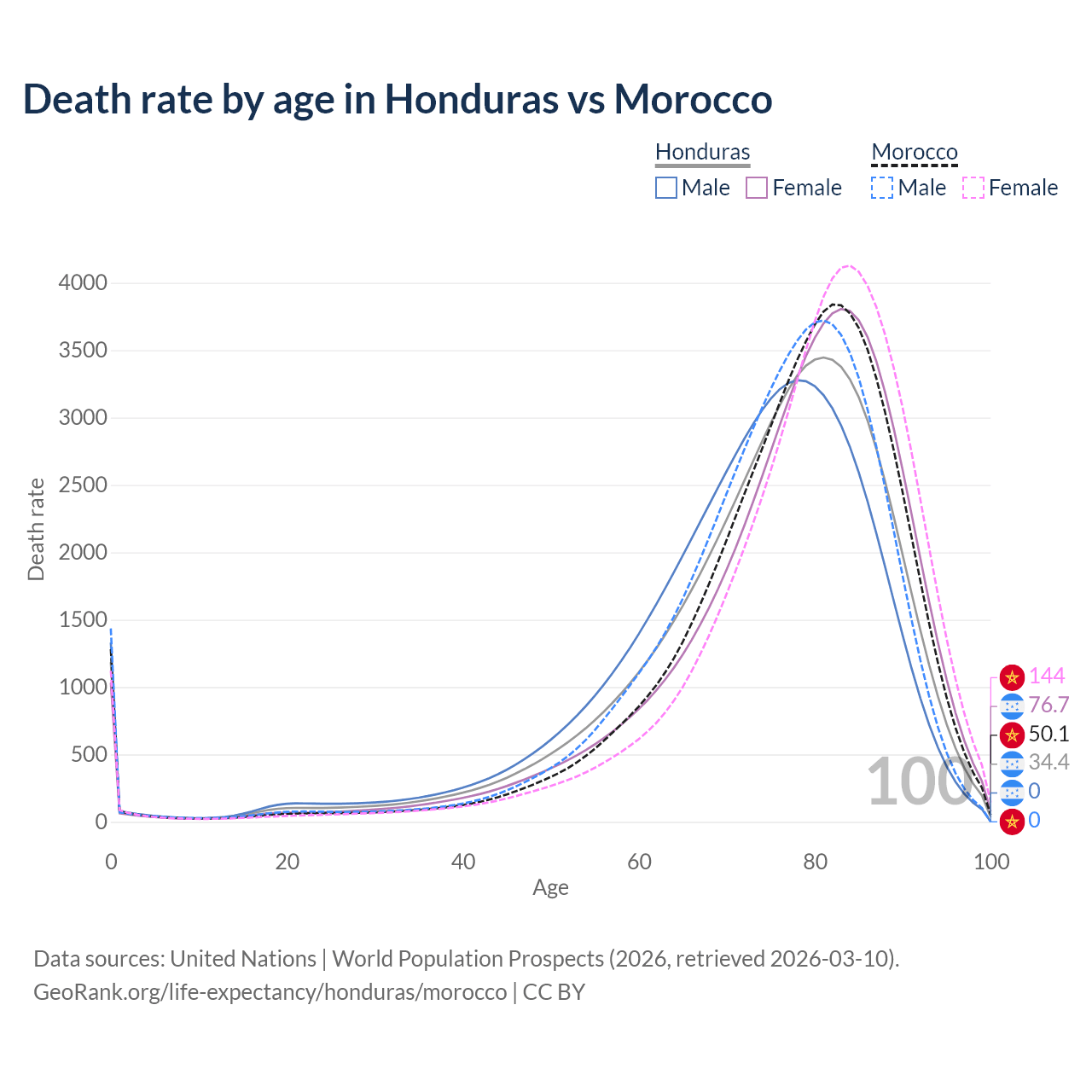 In Honduras, the most common age of death is 81, compared to 82 in Morocco. The median age of death is 77.1 in Honduras and 79.3 in Morocco, meaning only half of each cohort is expected to live past that age.