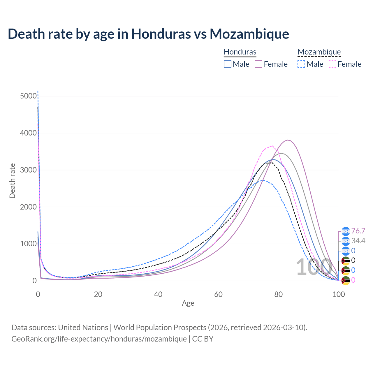 In Honduras, the most common age of death is 81, compared to 0 in Mozambique. The median age of death is 77.1 in Honduras and 71.2 in Mozambique, meaning only half of each cohort is expected to live past that age.
