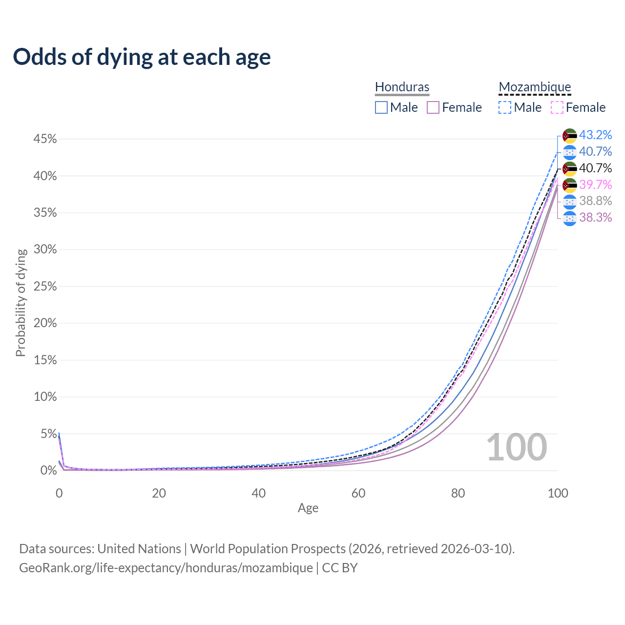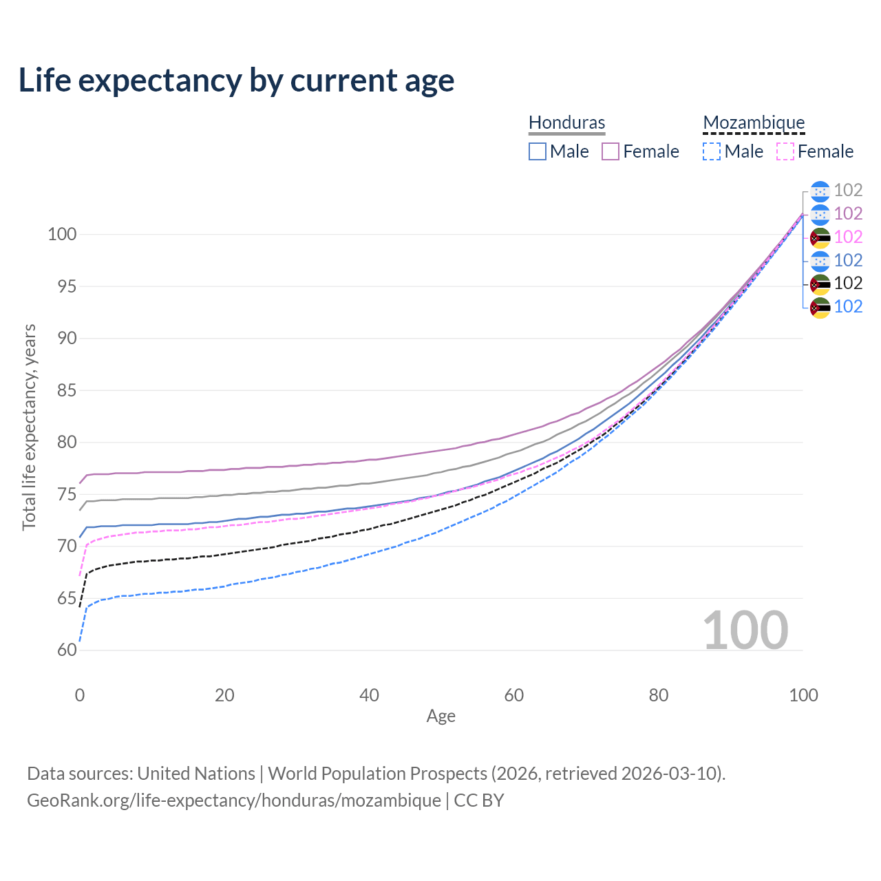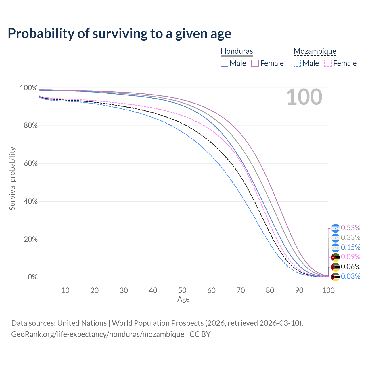 This life expectancy calculator shows the odds of living to 100, 95, 90, and below based on current age for both males and females in Honduras and Mozambique, along with mean and median age of death. The calculations are based on the 2026 life tables (actuarial tables) from the UN World Population Prospects.