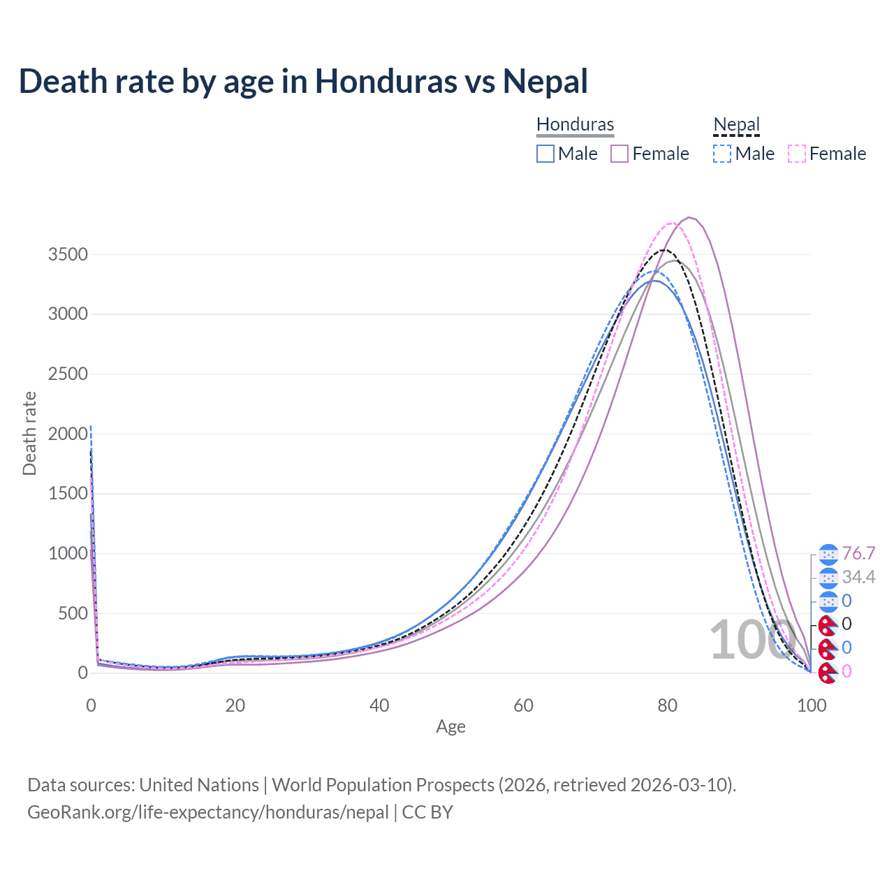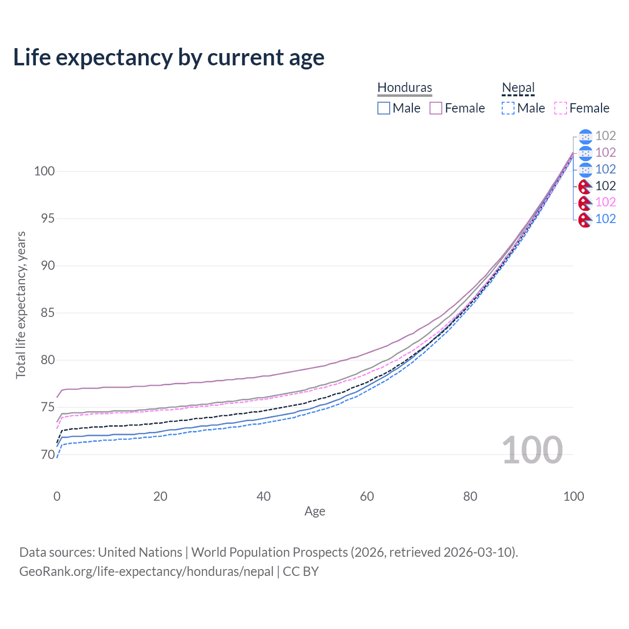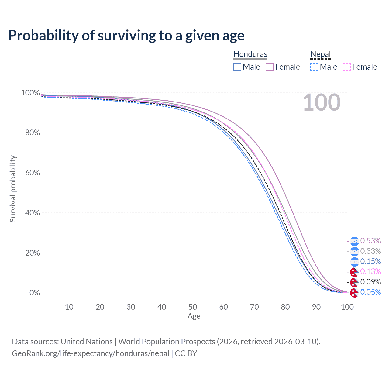 This life expectancy calculator shows the odds of living to 100, 95, 90, and below based on current age for both males and females in Honduras and Nepal, along with mean and median age of death. The calculations are based on the 2026 life tables (actuarial tables) from the UN World Population Prospects.