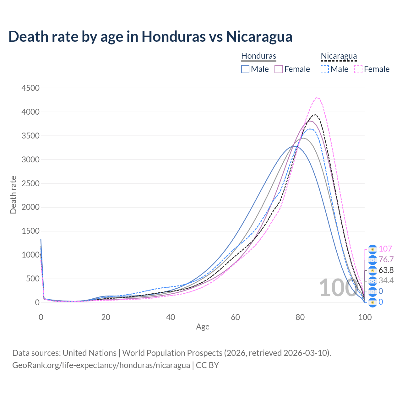 In Honduras, the most common age of death is 81, compared to 85 in Nicaragua. The median age of death is 77.1 in Honduras and 79.9 in Nicaragua, meaning only half of each cohort is expected to live past that age.