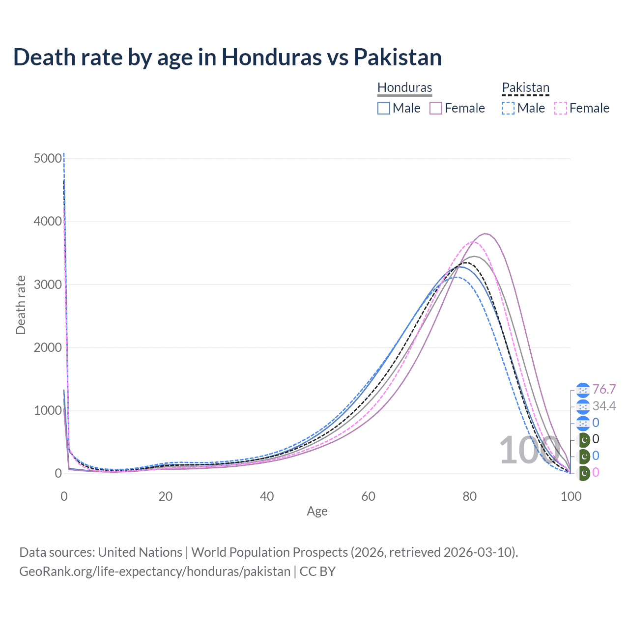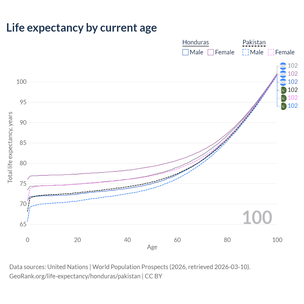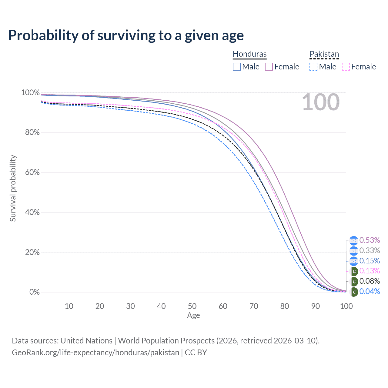 This life expectancy calculator shows the odds of living to 100, 95, 90, and below based on current age for both males and females in Honduras and Pakistan, along with mean and median age of death. The calculations are based on the 2026 life tables (actuarial tables) from the UN World Population Prospects.