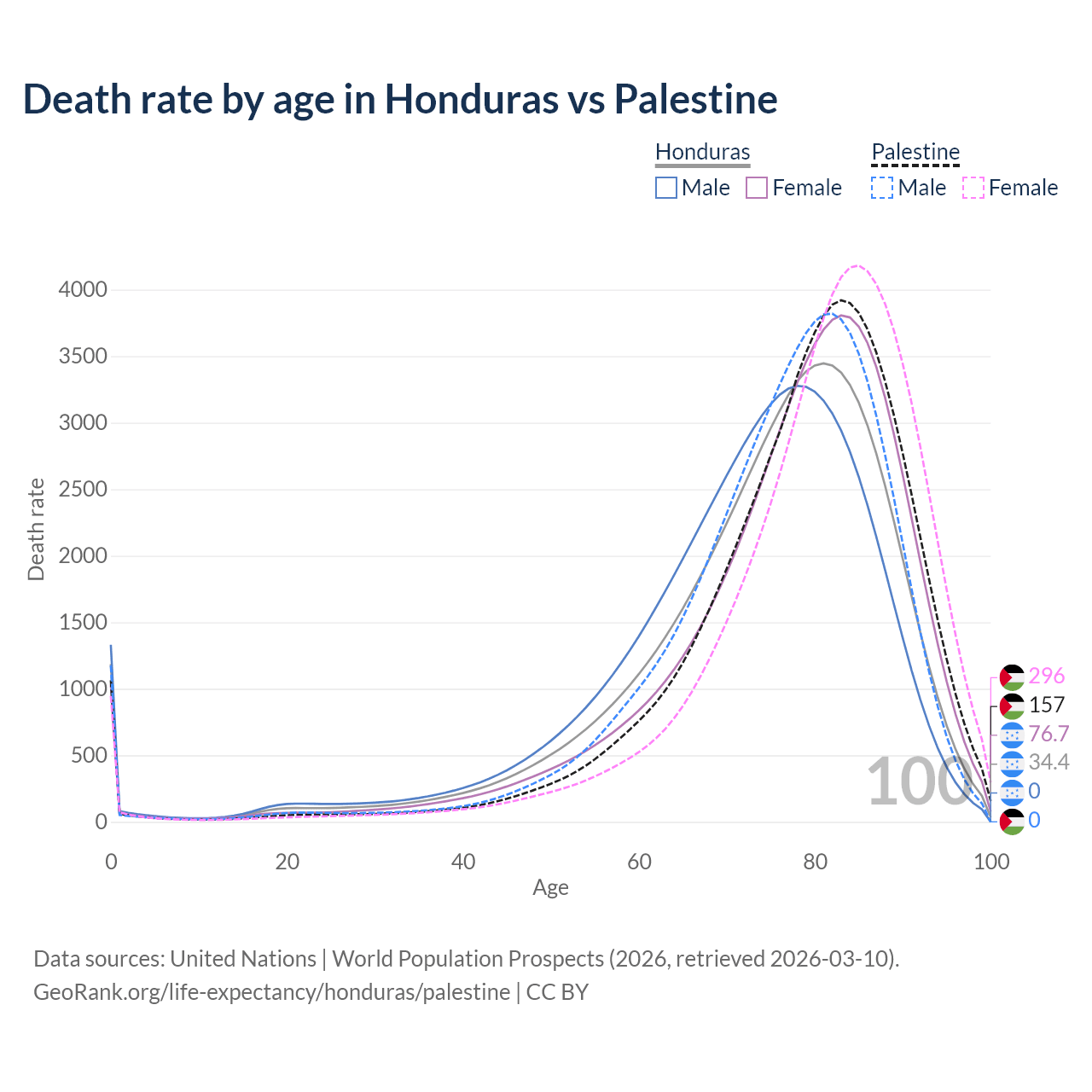 This life expectancy calculator shows the odds of living to 100, 95, 90, and below based on current age for both males and females in Honduras and Palestine, along with mean and median age of death. The calculations are based on the 2026 life tables (actuarial tables) from the UN World Population Prospects.