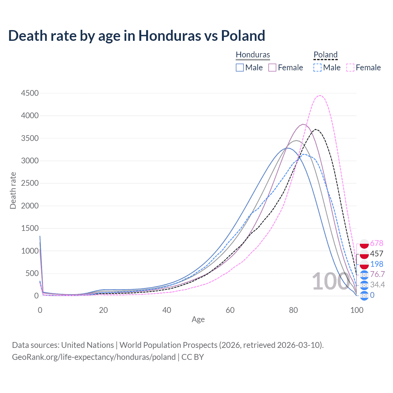 In Honduras, the most common age of death is 81, compared to 87 in Poland. The median age of death is 77.1 in Honduras and 82.5 in Poland, meaning only half of each cohort is expected to live past that age.