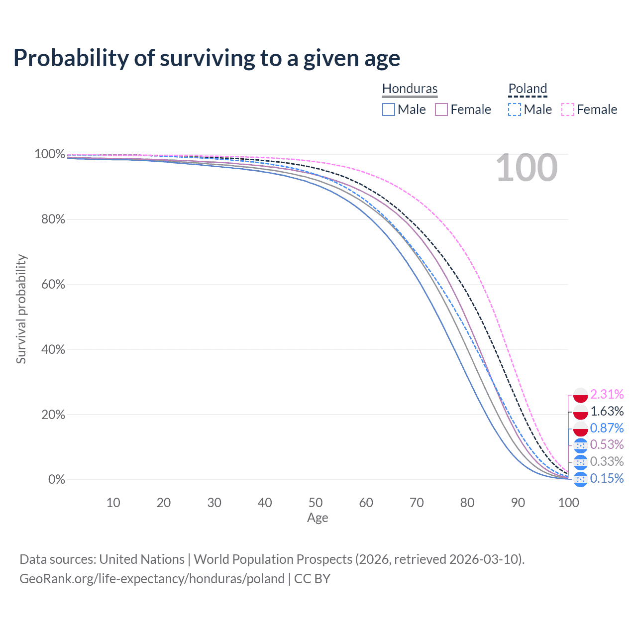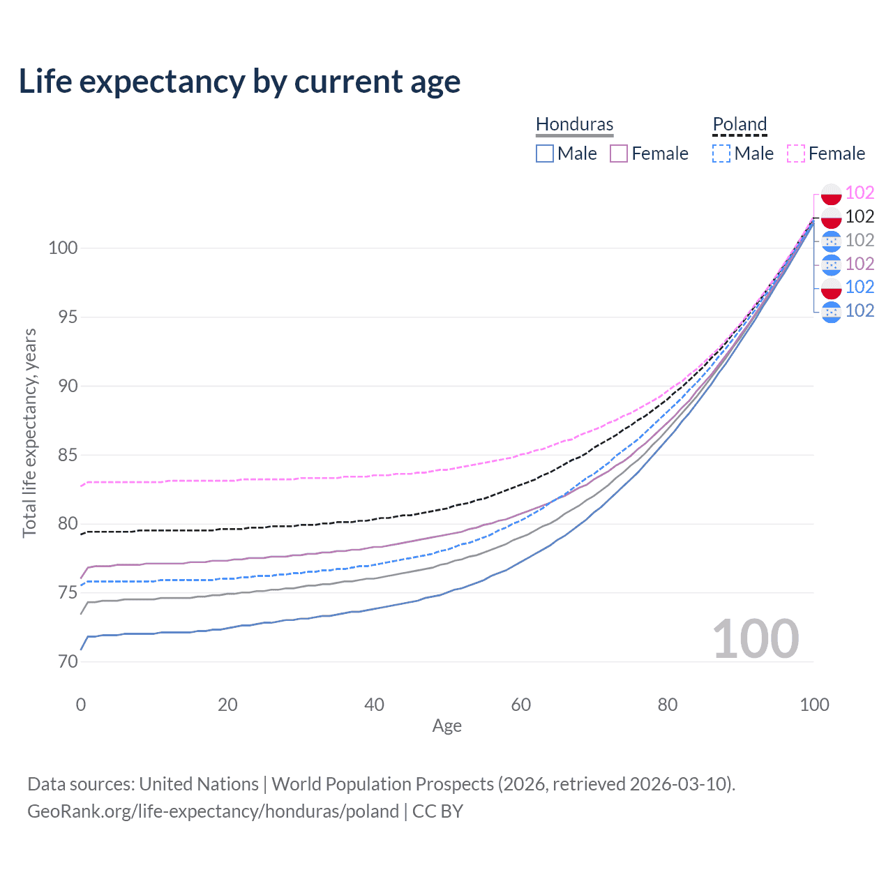 This life expectancy calculator shows the odds of living to 100, 95, 90, and below based on current age for both males and females in Honduras and Poland, along with mean and median age of death. The calculations are based on the 2026 life tables (actuarial tables) from the UN World Population Prospects.