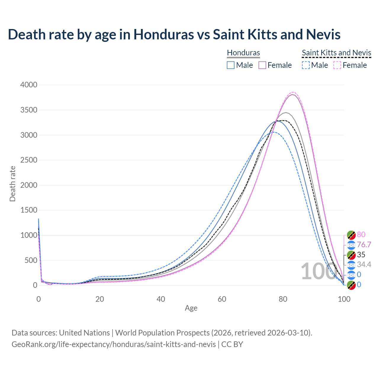 In Honduras, the most common age of death is 81, compared to 80 in Saint Kitts and Nevis. The median age of death is 77.1 in Honduras and 76.3 in Saint Kitts and Nevis, meaning only half of each cohort is expected to live past that age.