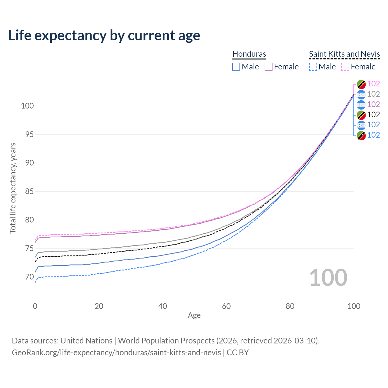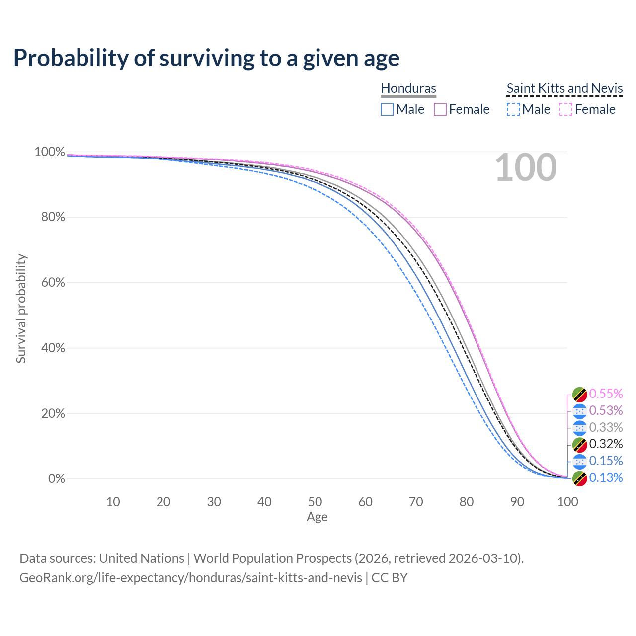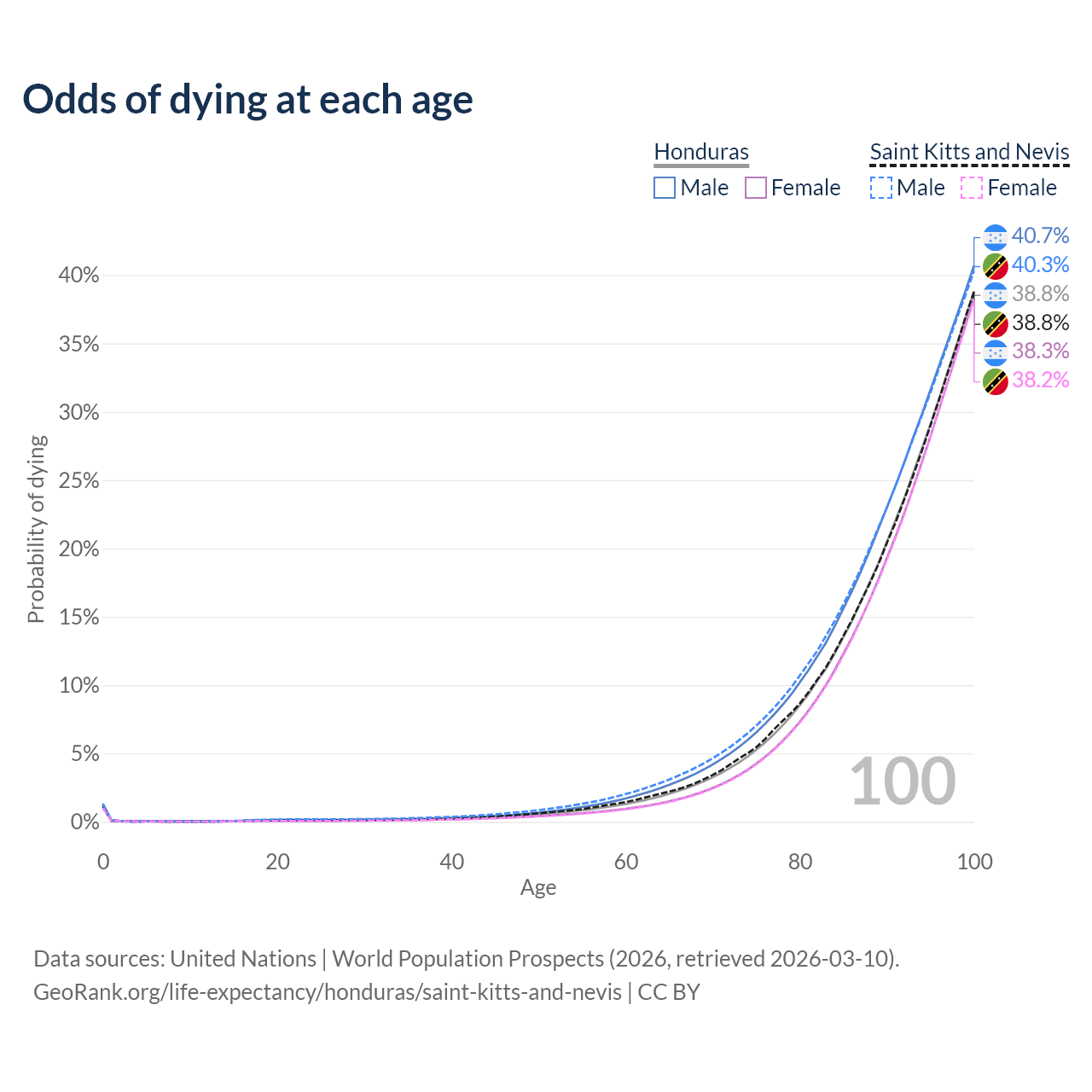 This life expectancy calculator shows the odds of living to 100, 95, 90, and below based on current age for both males and females in Honduras and Saint Kitts and Nevis, along with mean and median age of death. The calculations are based on the 2026 life tables (actuarial tables) from the UN World Population Prospects.