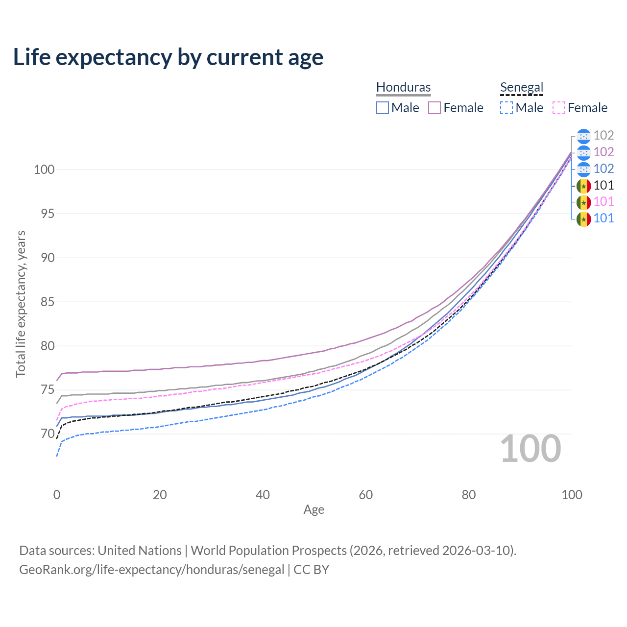 This life expectancy calculator shows the odds of living to 100, 95, 90, and below based on current age for both males and females in Honduras and Senegal, along with mean and median age of death. The calculations are based on the 2026 life tables (actuarial tables) from the UN World Population Prospects.