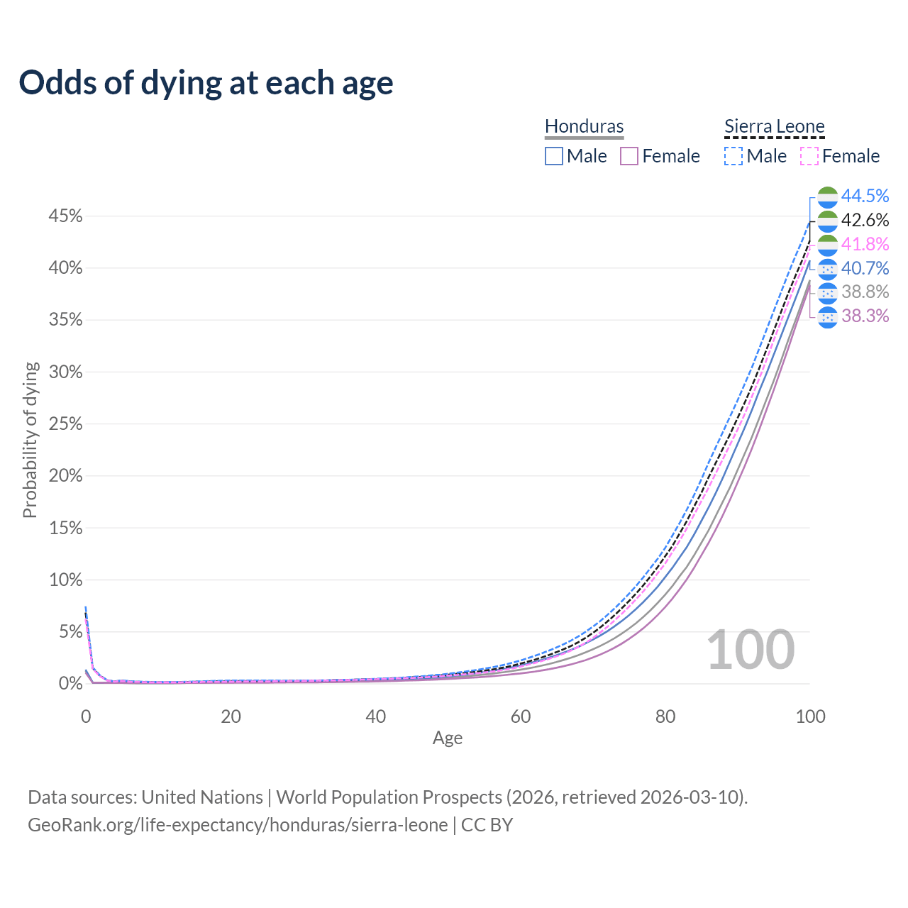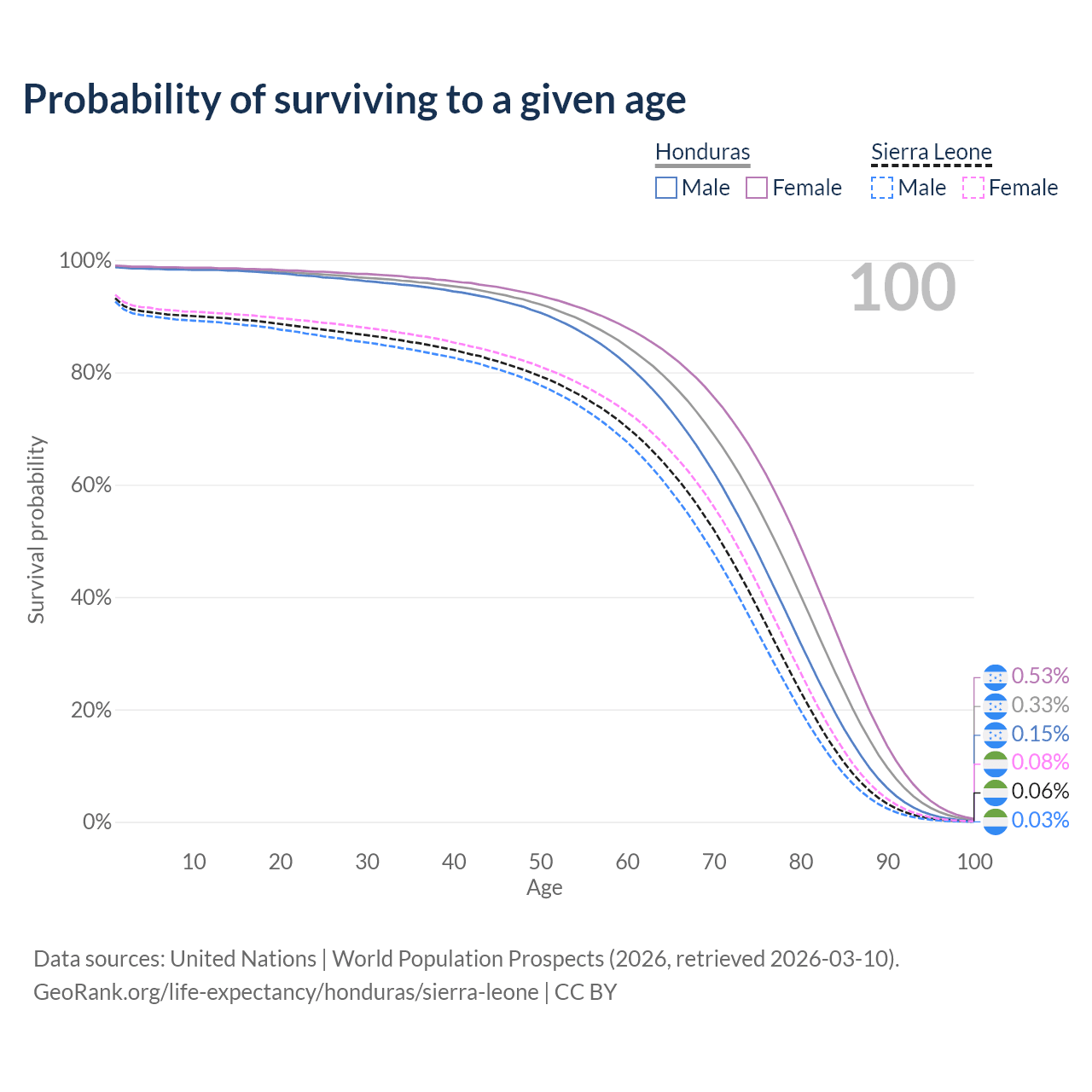 This life expectancy calculator shows the odds of living to 100, 95, 90, and below based on current age for both males and females in Honduras and Sierra Leone, along with mean and median age of death. The calculations are based on the 2026 life tables (actuarial tables) from the UN World Population Prospects.