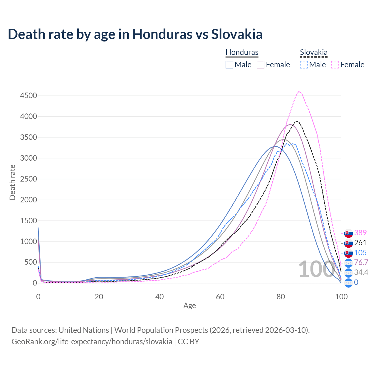 This life expectancy calculator shows the odds of living to 100, 95, 90, and below based on current age for both males and females in Honduras and Slovakia, along with mean and median age of death. The calculations are based on the 2026 life tables (actuarial tables) from the UN World Population Prospects.