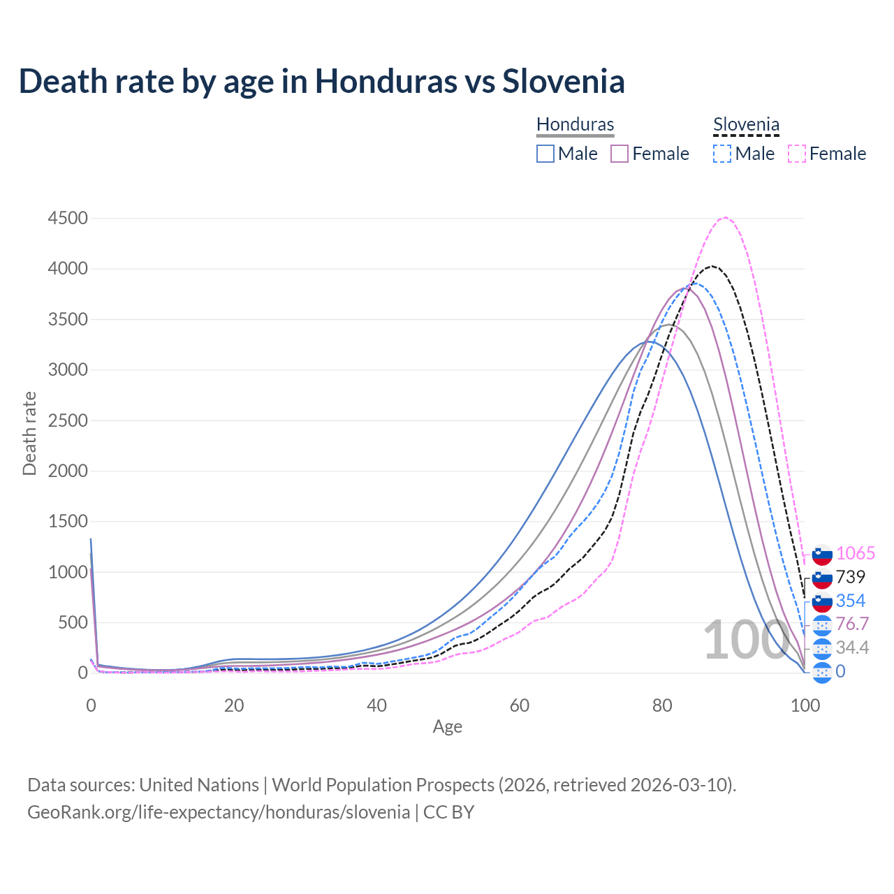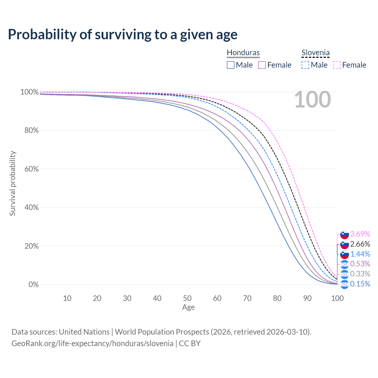 This life expectancy calculator shows the odds of living to 100, 95, 90, and below based on current age for both males and females in Honduras and Slovenia, along with mean and median age of death. The calculations are based on the 2026 life tables (actuarial tables) from the UN World Population Prospects.