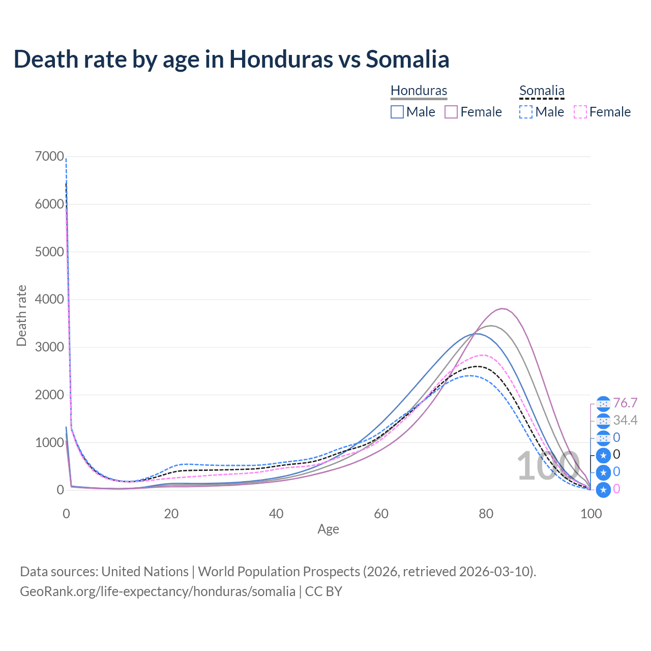 In Honduras, the most common age of death is 81, compared to 0 in Somalia. The median age of death is 77.1 in Honduras and 69 in Somalia, meaning only half of each cohort is expected to live past that age.