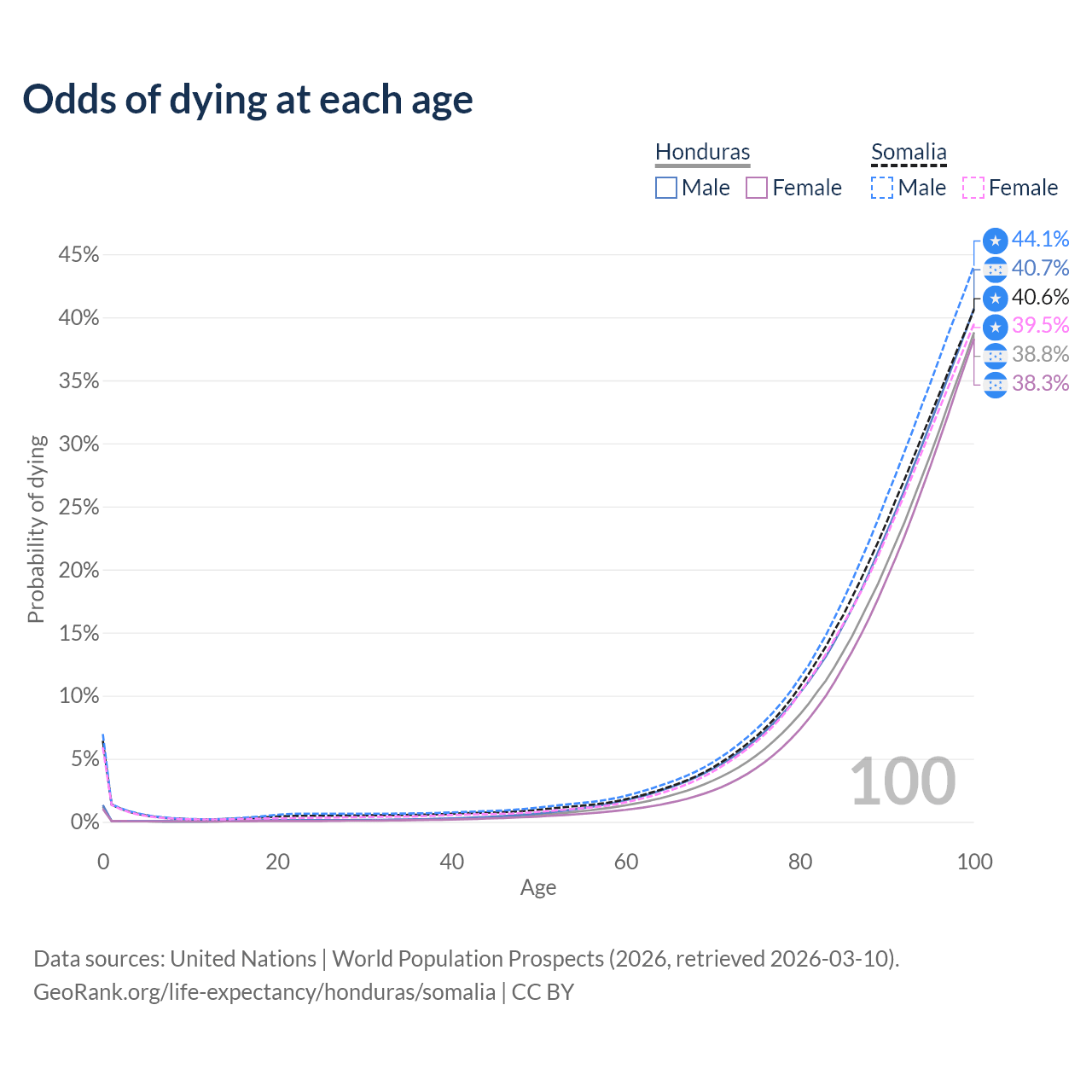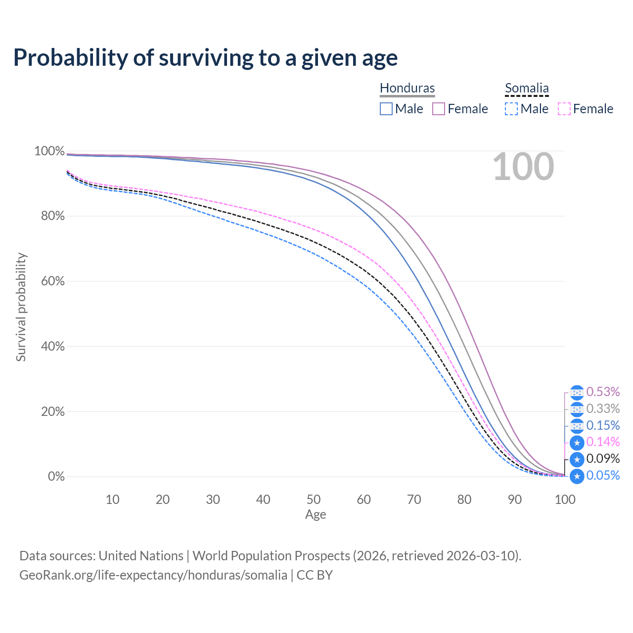 This life expectancy calculator shows the odds of living to 100, 95, 90, and below based on current age for both males and females in Honduras and Somalia, along with mean and median age of death. The calculations are based on the 2026 life tables (actuarial tables) from the UN World Population Prospects.