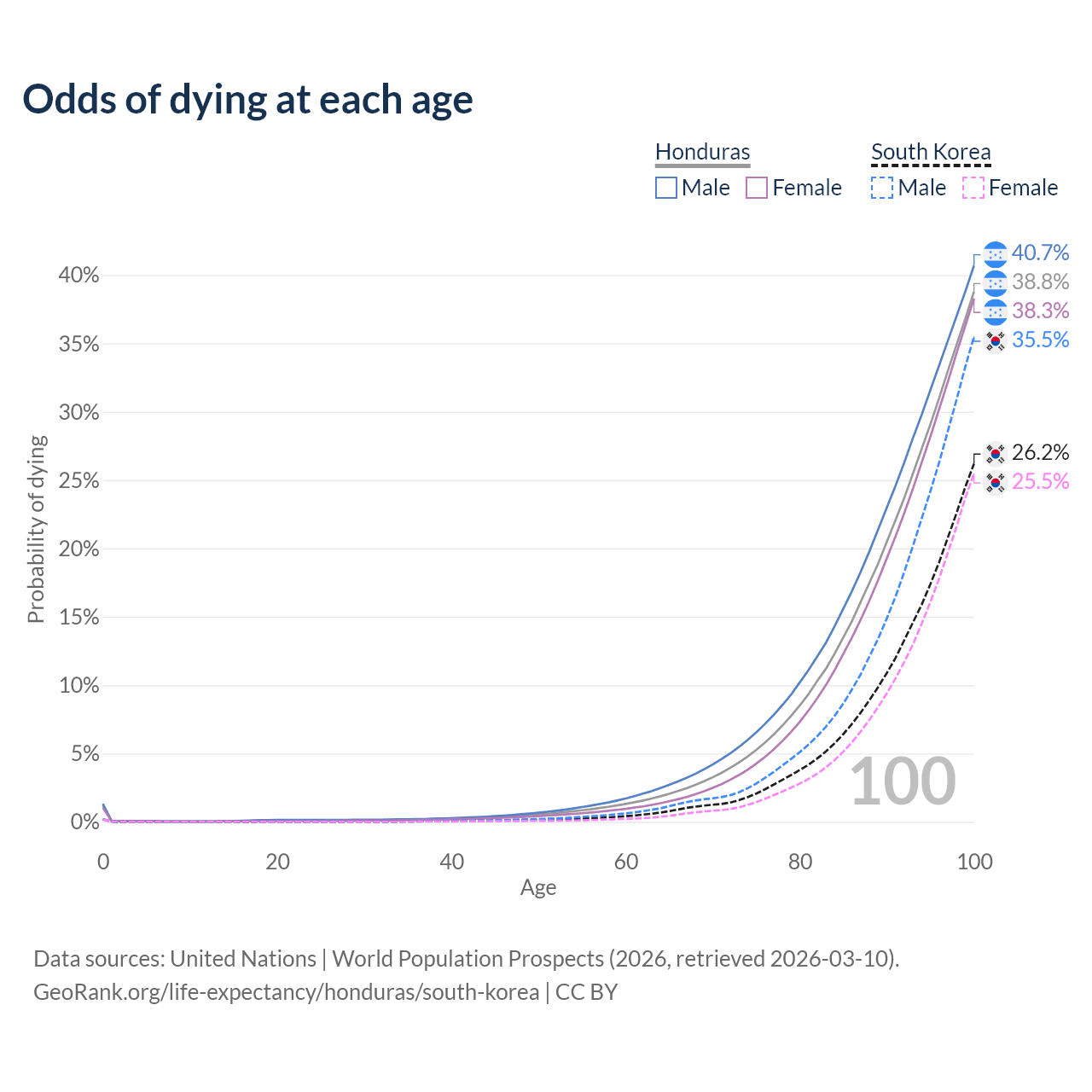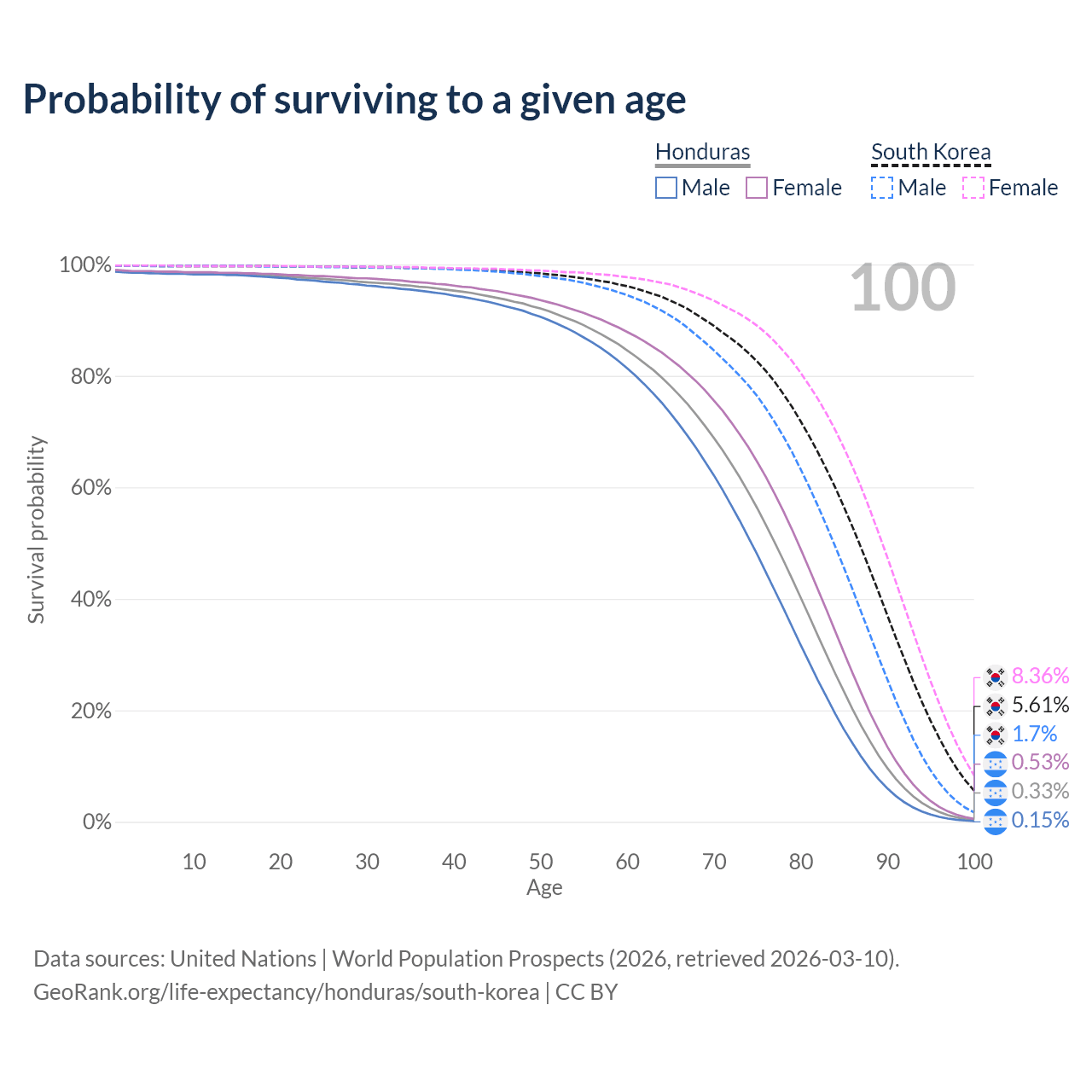 This life expectancy calculator shows the odds of living to 100, 95, 90, and below based on current age for both males and females in Honduras and South Korea, along with mean and median age of death. The calculations are based on the 2026 life tables (actuarial tables) from the UN World Population Prospects.