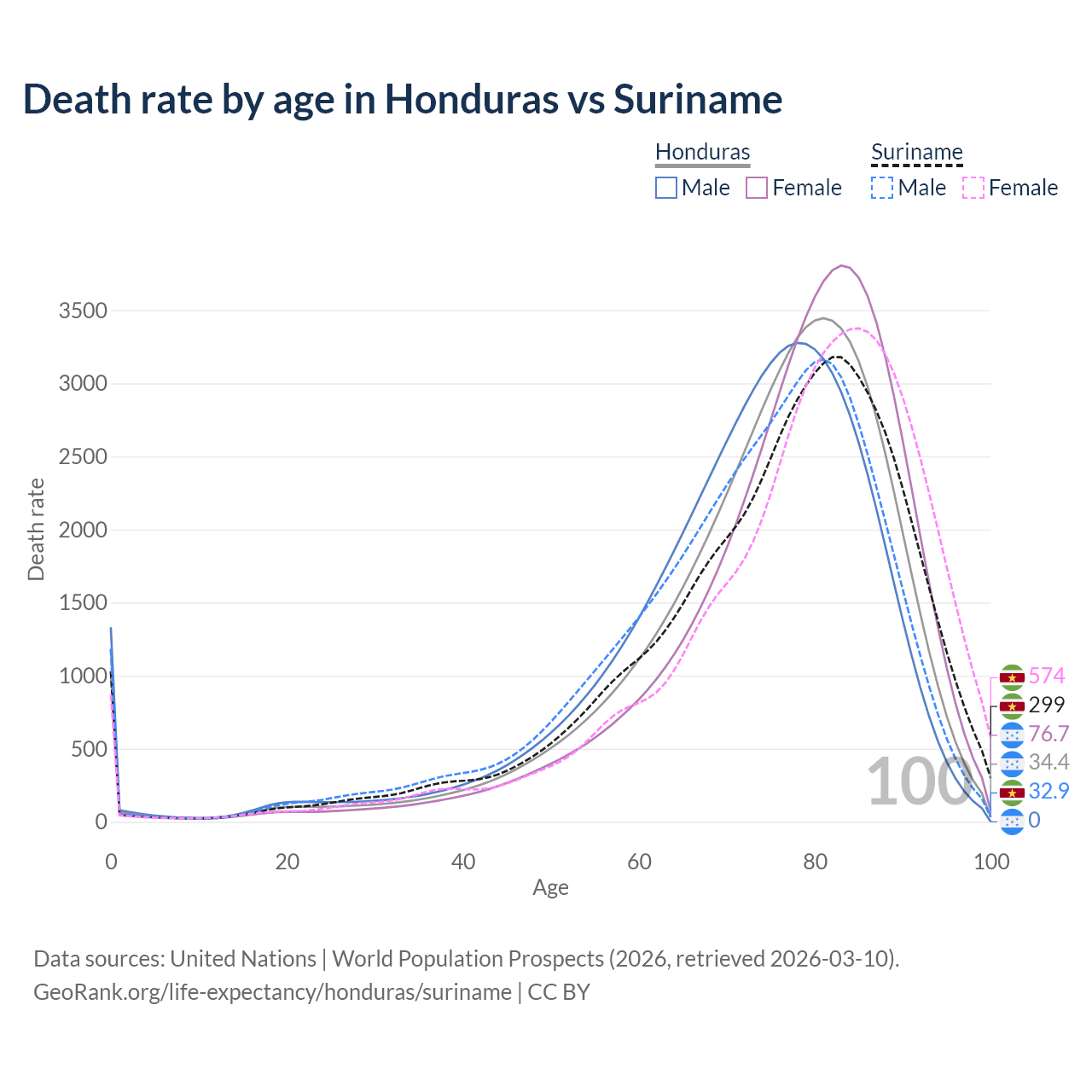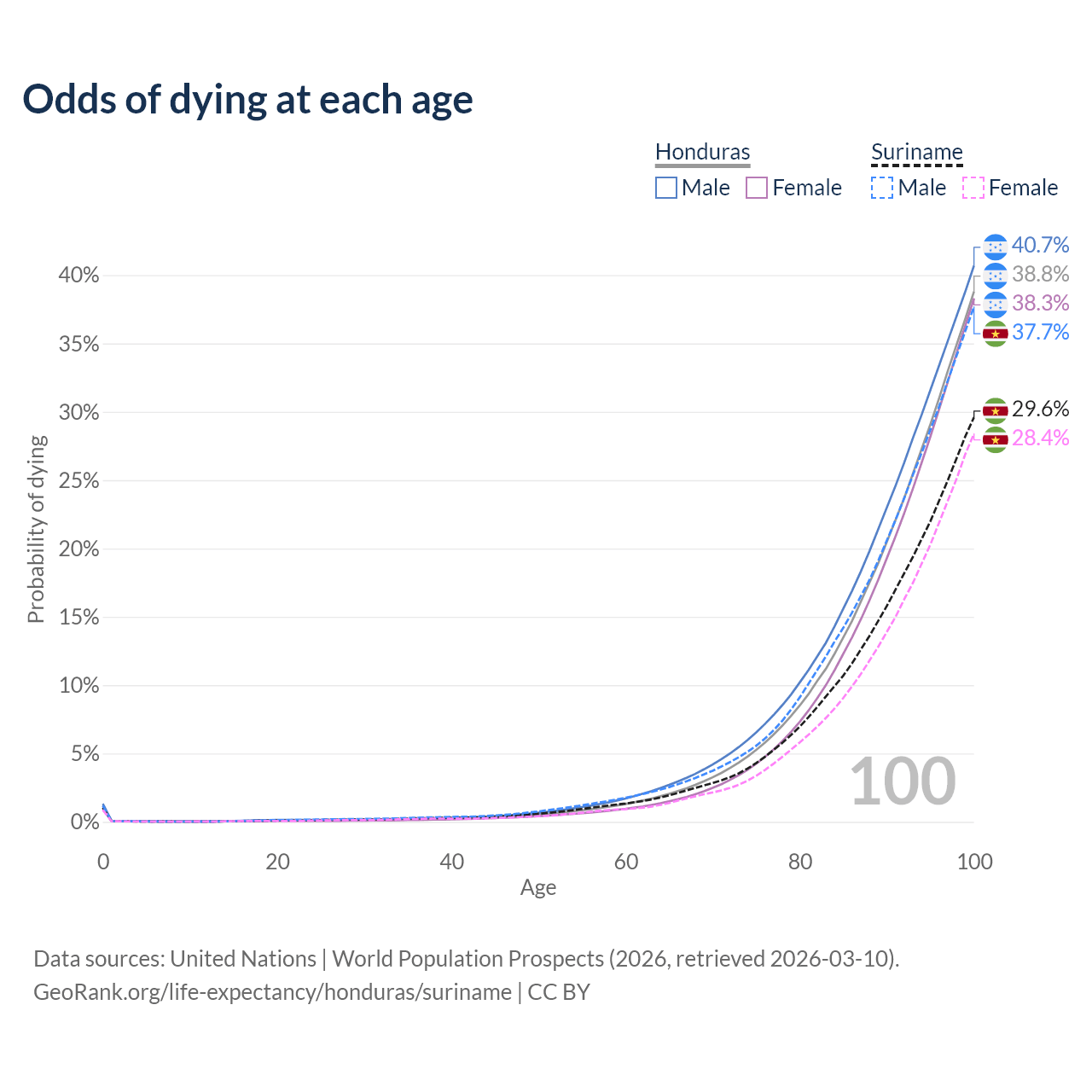 This life expectancy calculator shows the odds of living to 100, 95, 90, and below based on current age for both males and females in Honduras and Suriname, along with mean and median age of death. The calculations are based on the 2026 life tables (actuarial tables) from the UN World Population Prospects.
