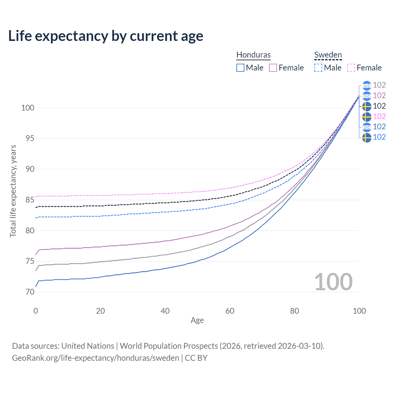 This life expectancy calculator shows the odds of living to 100, 95, 90, and below based on current age for both males and females in Honduras and Sweden, along with mean and median age of death. The calculations are based on the 2026 life tables (actuarial tables) from the UN World Population Prospects.