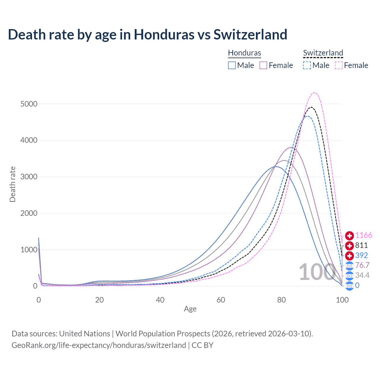 In Honduras, the most common age of death is 81, compared to 90 in Switzerland. The median age of death is 77.1 in Honduras and 87.2 in Switzerland, meaning only half of each cohort is expected to live past that age.