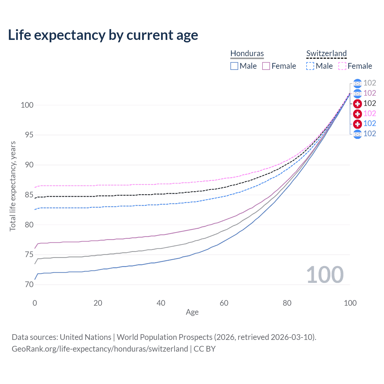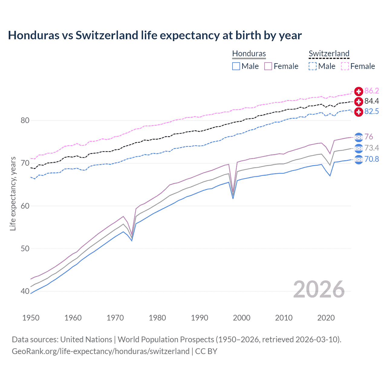 The average life expectancy at birth is 73.4 years in Honduras vs 84.4 in Switzerland. Honduras is ranked 110/197 by life expectancy, and Switzerland is 6/197. In Honduras, the life expectancy is 70.8 years for males and 76 years for females. In Switzerland, it's 82.5 years for males and 86.2 years for females.