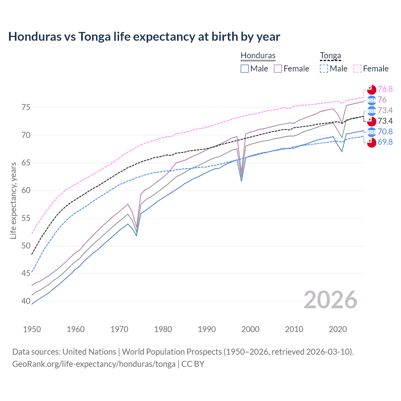 The average life expectancy at birth is 73.4 years in Honduras vs 73.4 in Tonga. Honduras is ranked 110/197 by life expectancy, and Tonga is 109/197. In Honduras, the life expectancy is 70.8 years for males and 76 years for females. In Tonga, it's 69.8 years for males and 76.8 years for females.