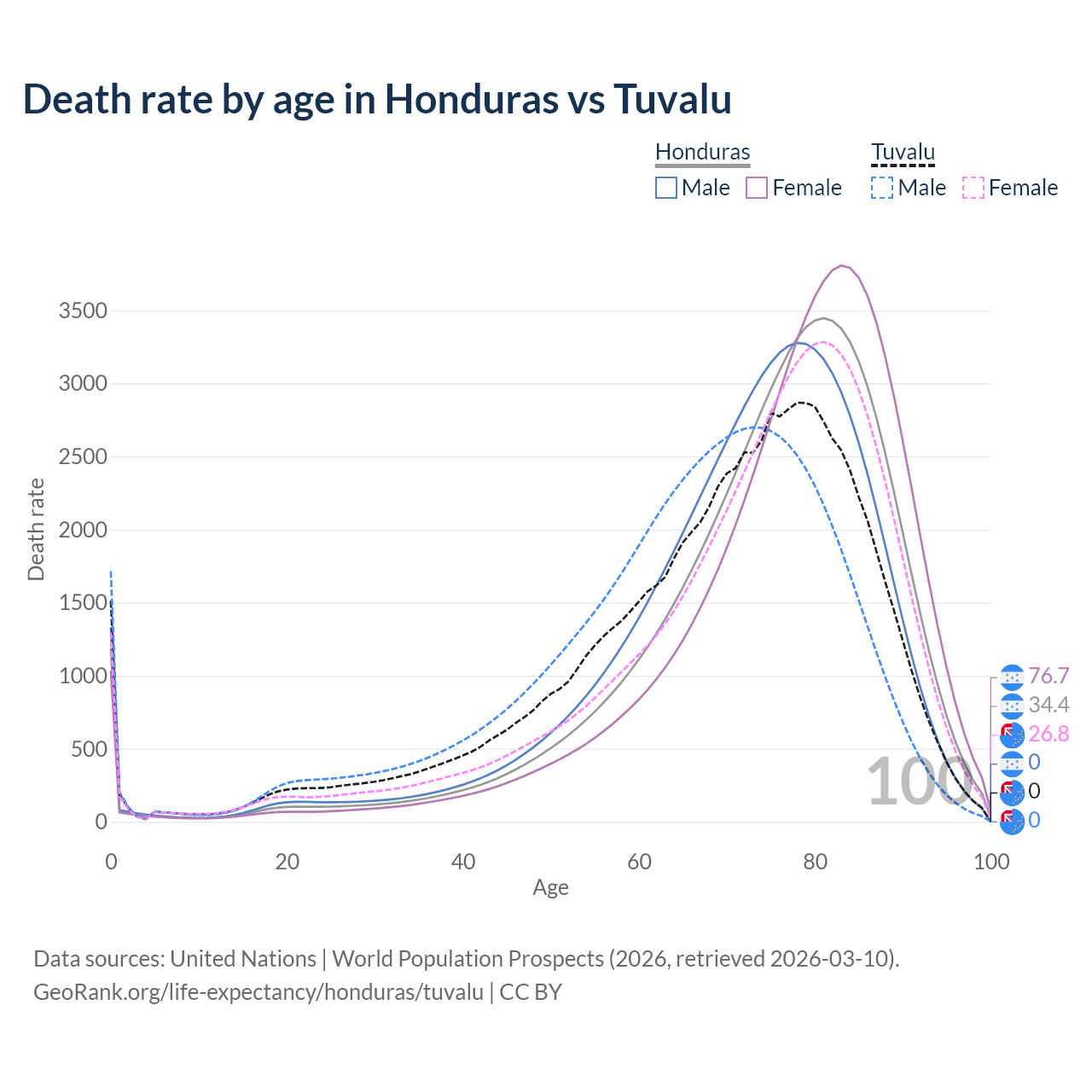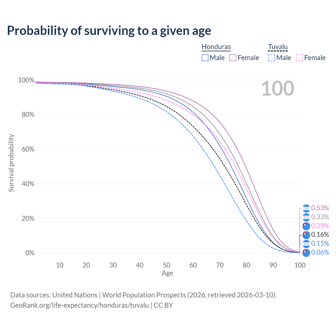 This life expectancy calculator shows the odds of living to 100, 95, 90, and below based on current age for both males and females in Honduras and Tuvalu, along with mean and median age of death. The calculations are based on the 2026 life tables (actuarial tables) from the UN World Population Prospects.