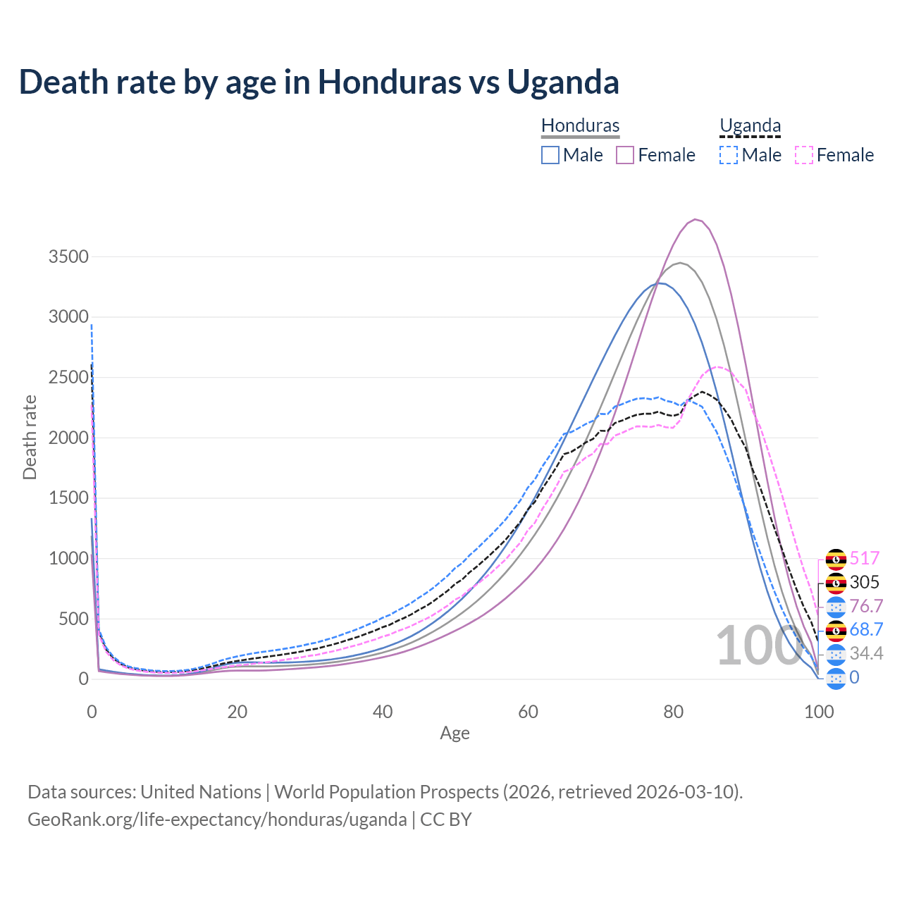 In Honduras, the most common age of death is 81, compared to 0 in Uganda. The median age of death is 77.1 in Honduras and 73.3 in Uganda, meaning only half of each cohort is expected to live past that age.