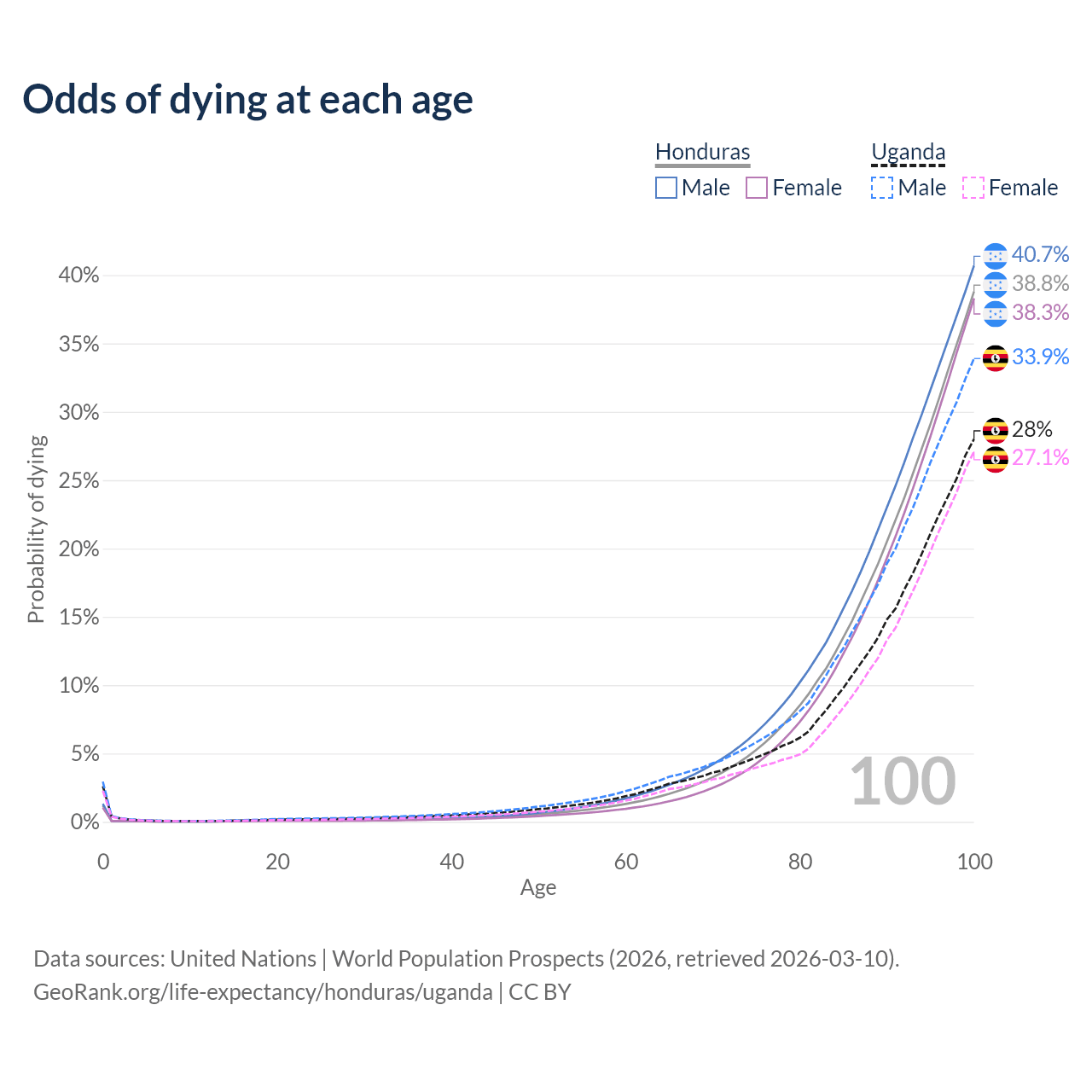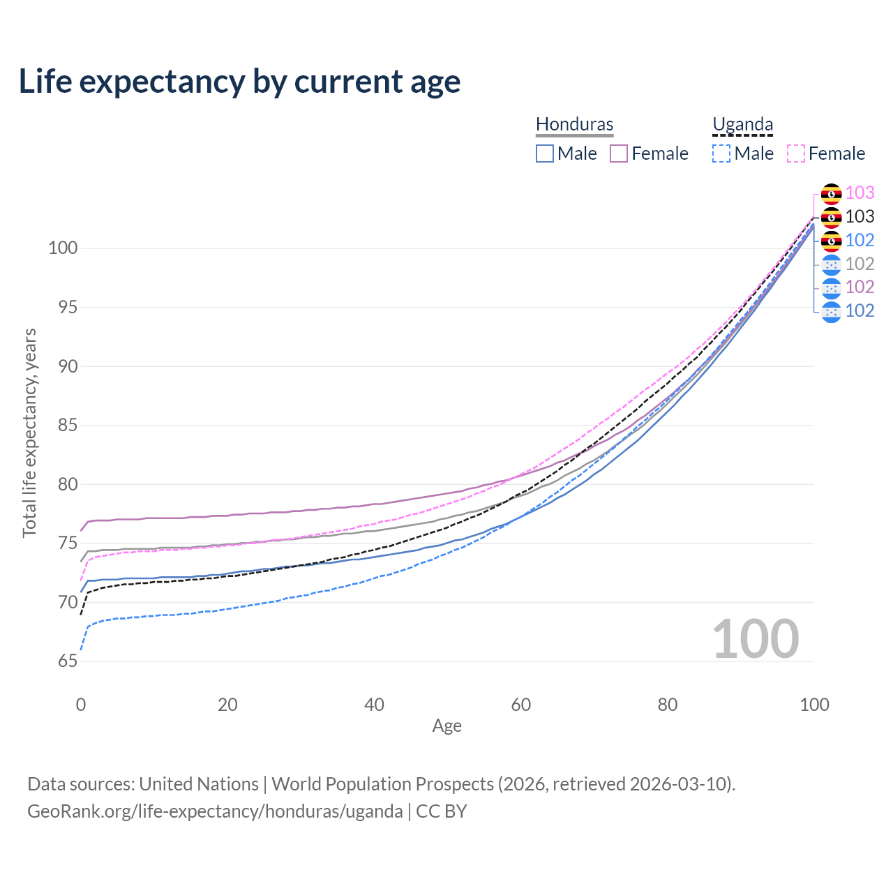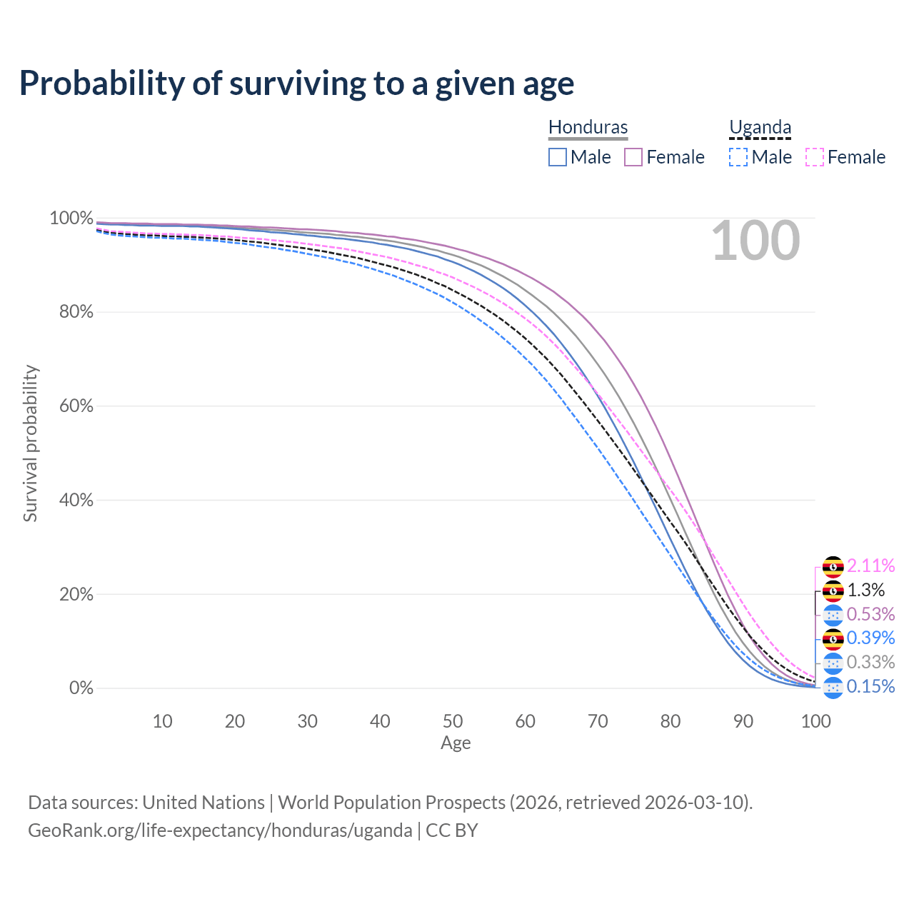This life expectancy calculator shows the odds of living to 100, 95, 90, and below based on current age for both males and females in Honduras and Uganda, along with mean and median age of death. The calculations are based on the 2026 life tables (actuarial tables) from the UN World Population Prospects.