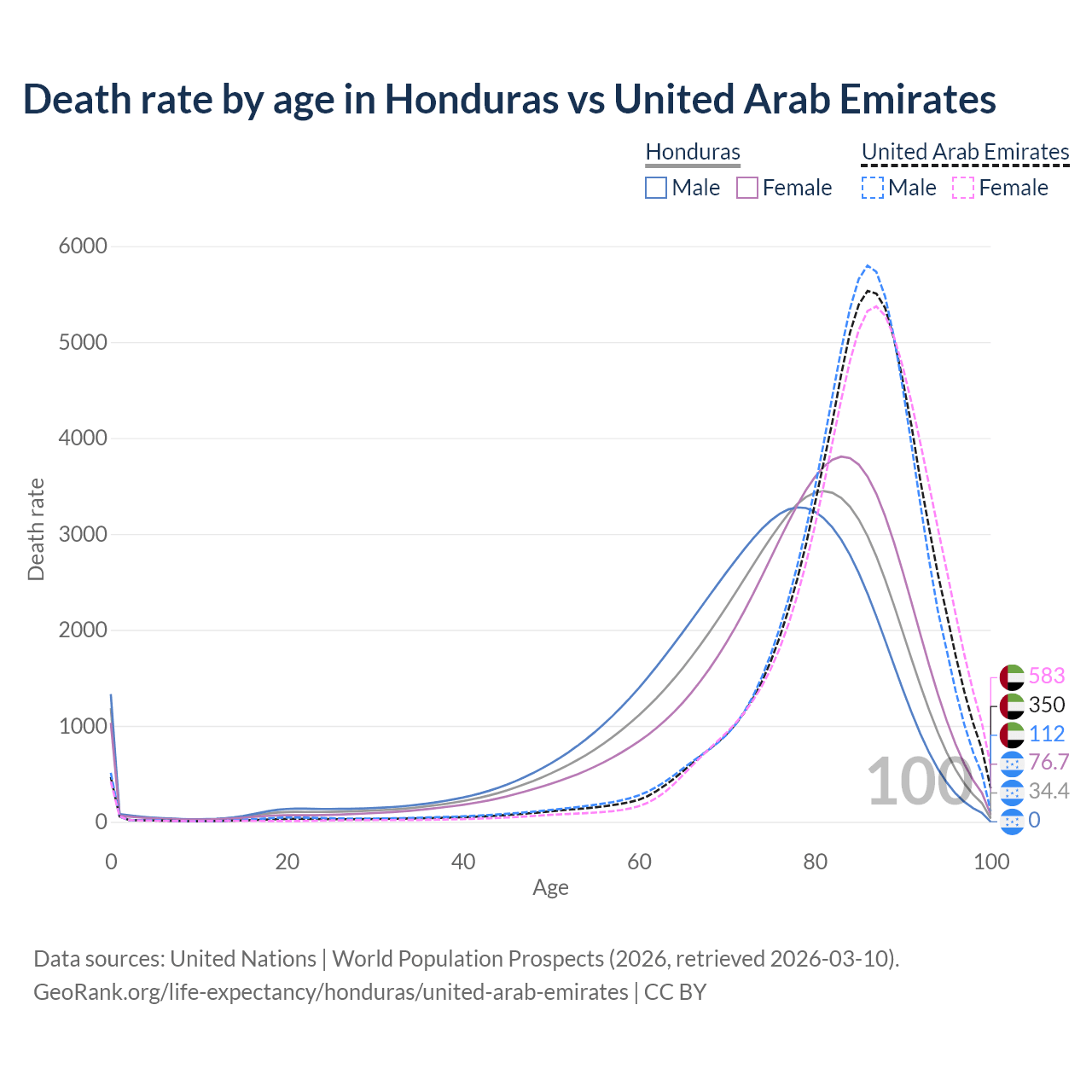 In Honduras, the most common age of death is 81, compared to 86 in the United Arab Emirates. The median age of death is 77.1 in Honduras and 85.6 in the United Arab Emirates, meaning only half of each cohort is expected to live past that age.