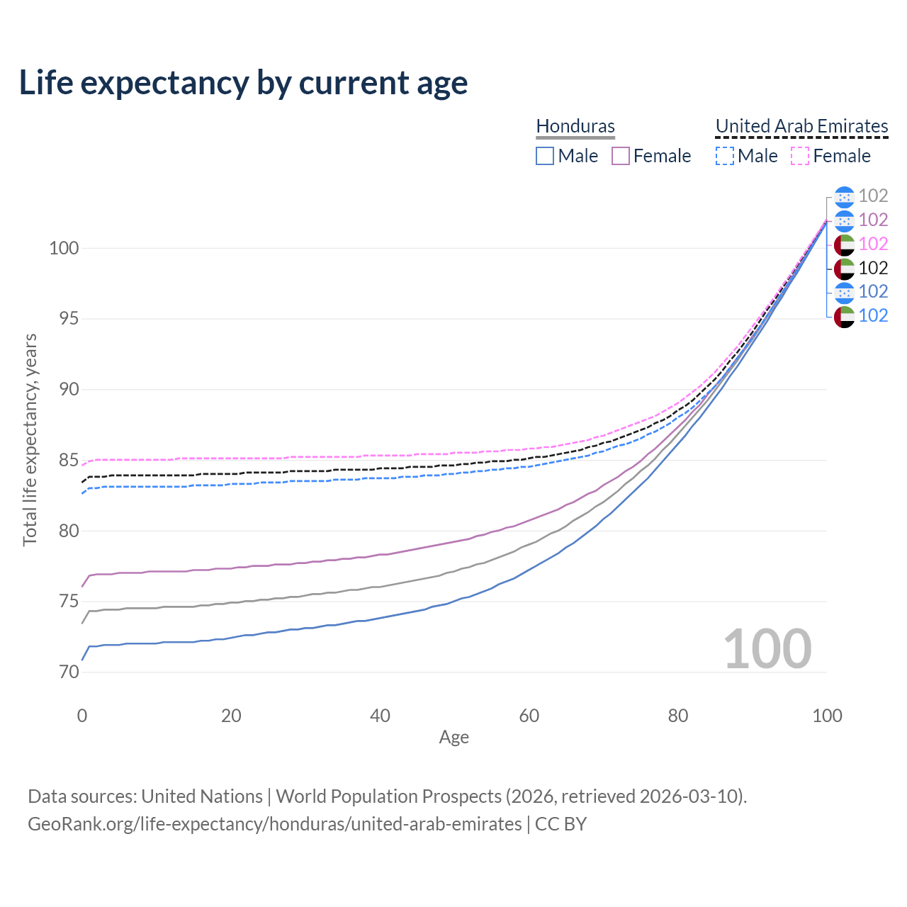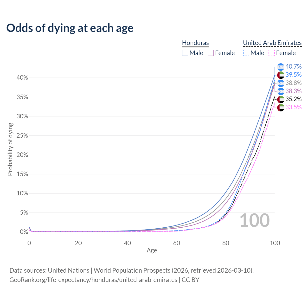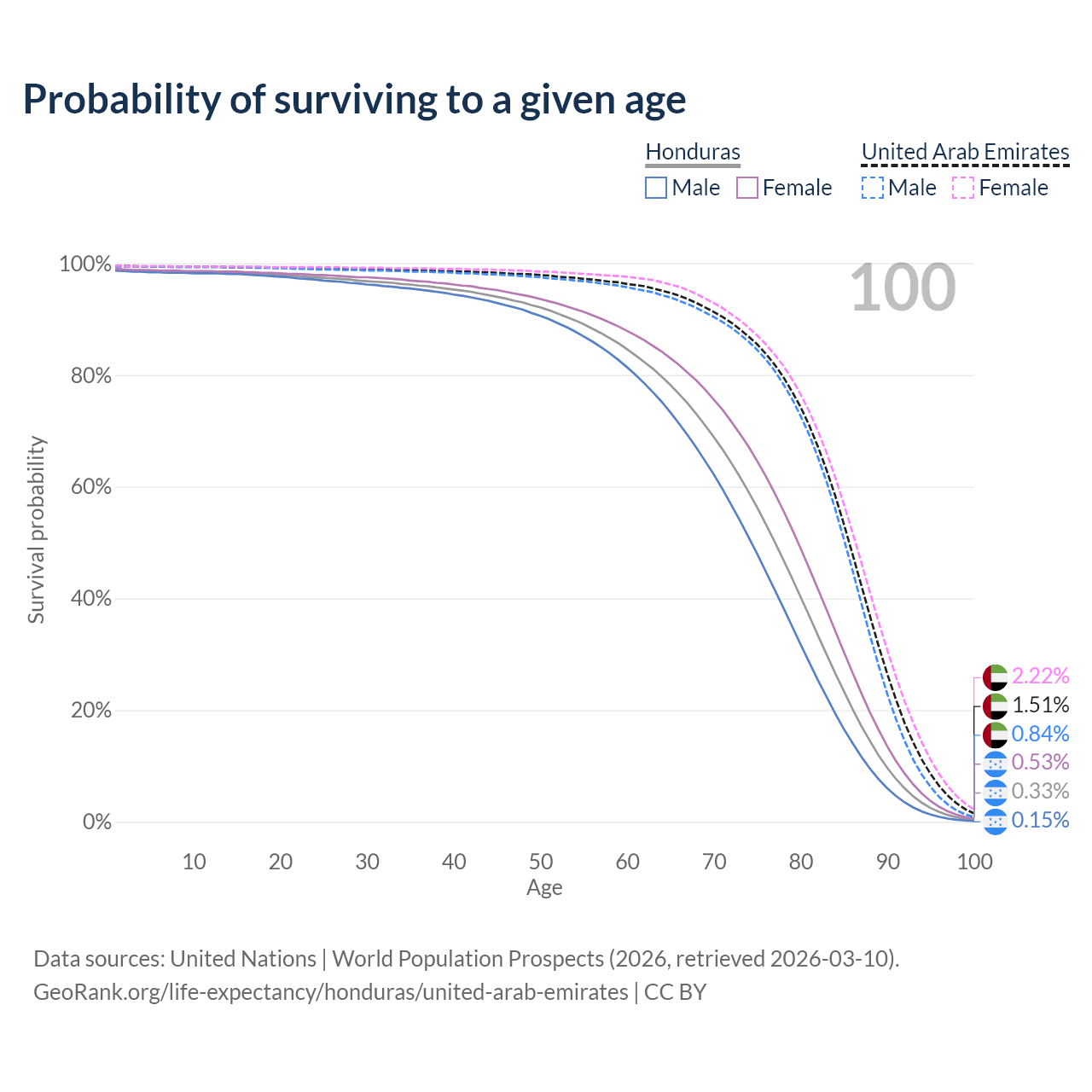 This life expectancy calculator shows the odds of living to 100, 95, 90, and below based on current age for both males and females in Honduras and the United Arab Emirates, along with mean and median age of death. The calculations are based on the 2026 life tables (actuarial tables) from the UN World Population Prospects.