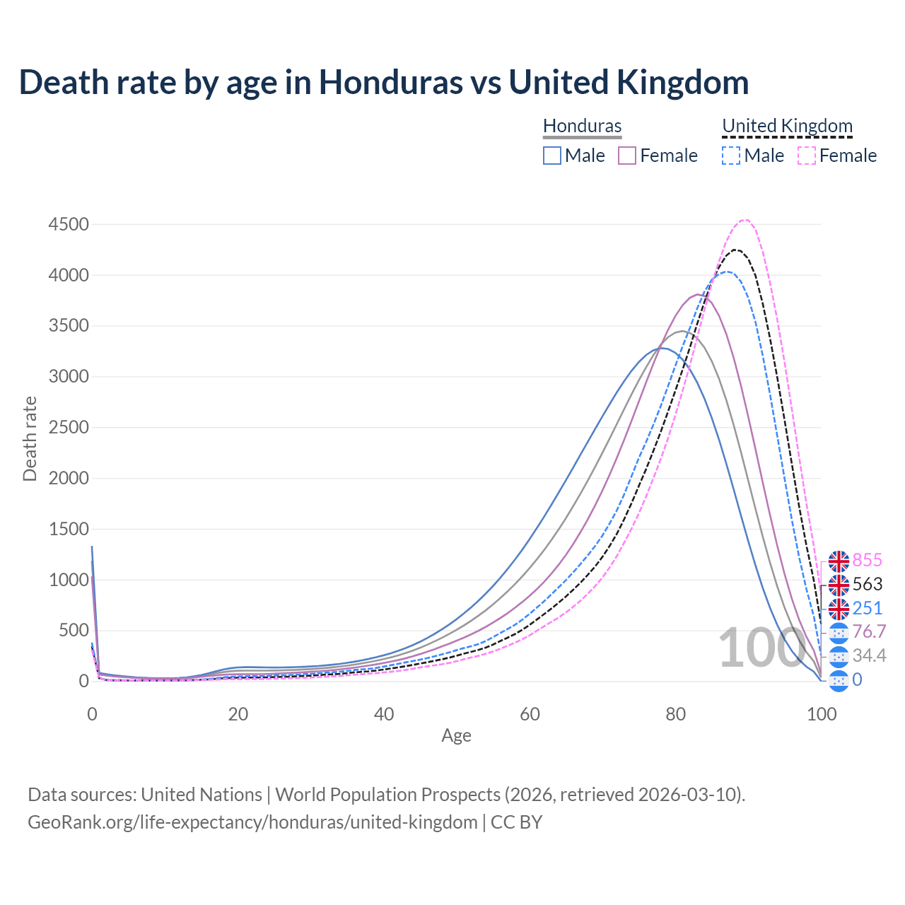 In Honduras, the most common age of death is 81, compared to 88 in the United Kingdom. The median age of death is 77.1 in Honduras and 84.9 in the United Kingdom, meaning only half of each cohort is expected to live past that age.