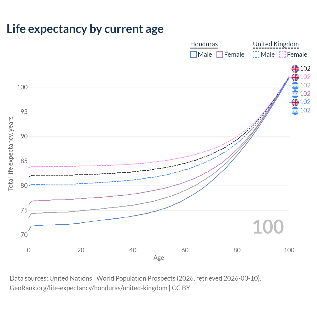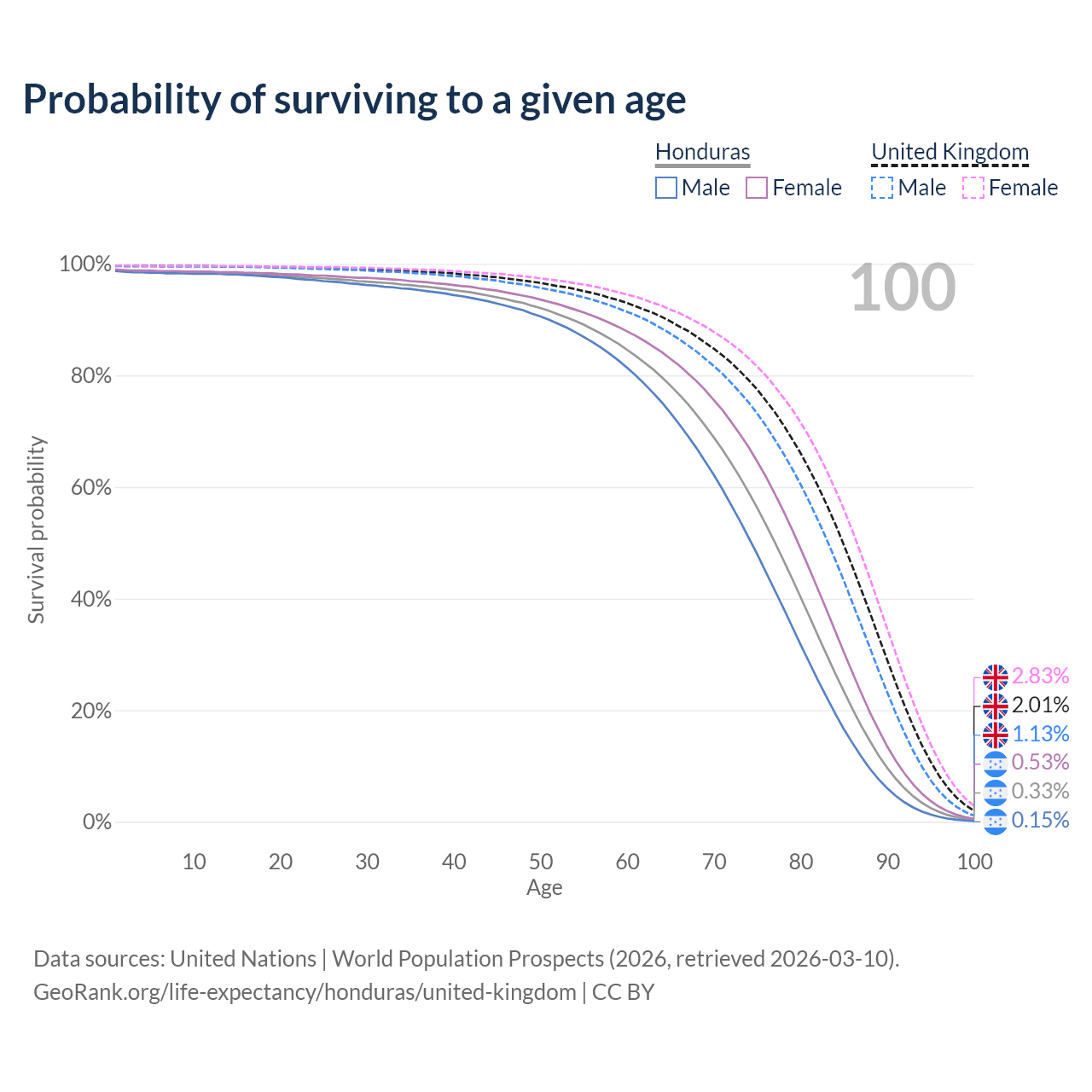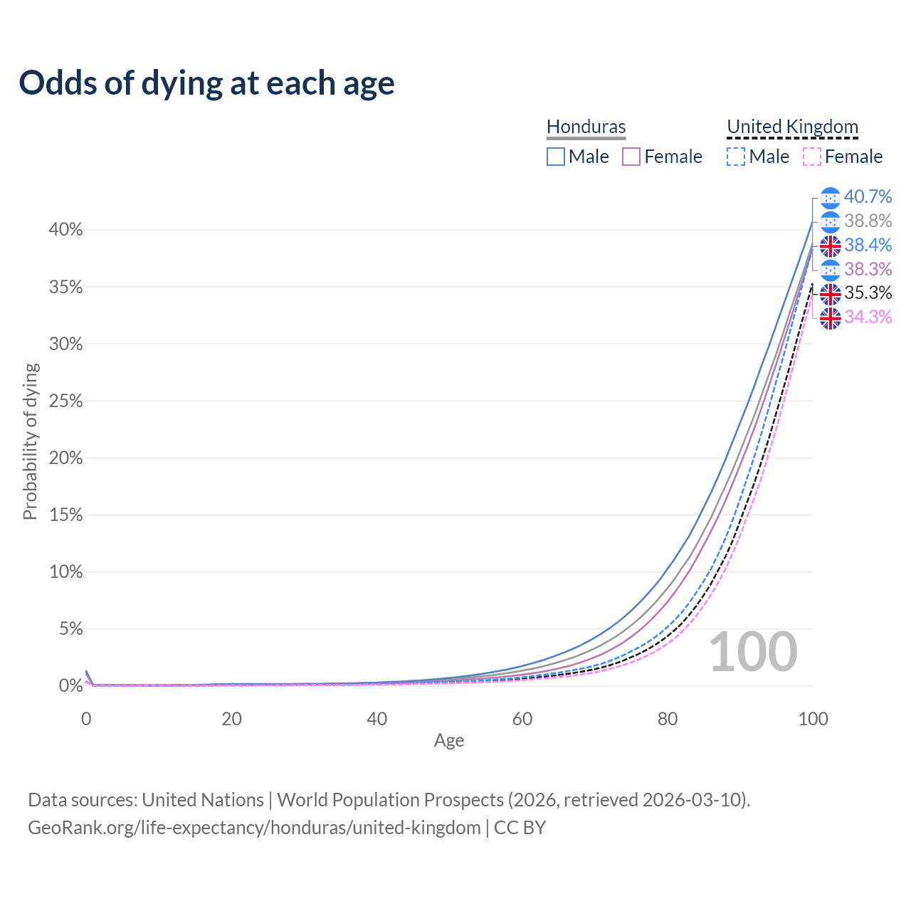 This life expectancy calculator shows the odds of living to 100, 95, 90, and below based on current age for both males and females in Honduras and the United Kingdom, along with mean and median age of death. The calculations are based on the 2026 life tables (actuarial tables) from the UN World Population Prospects.