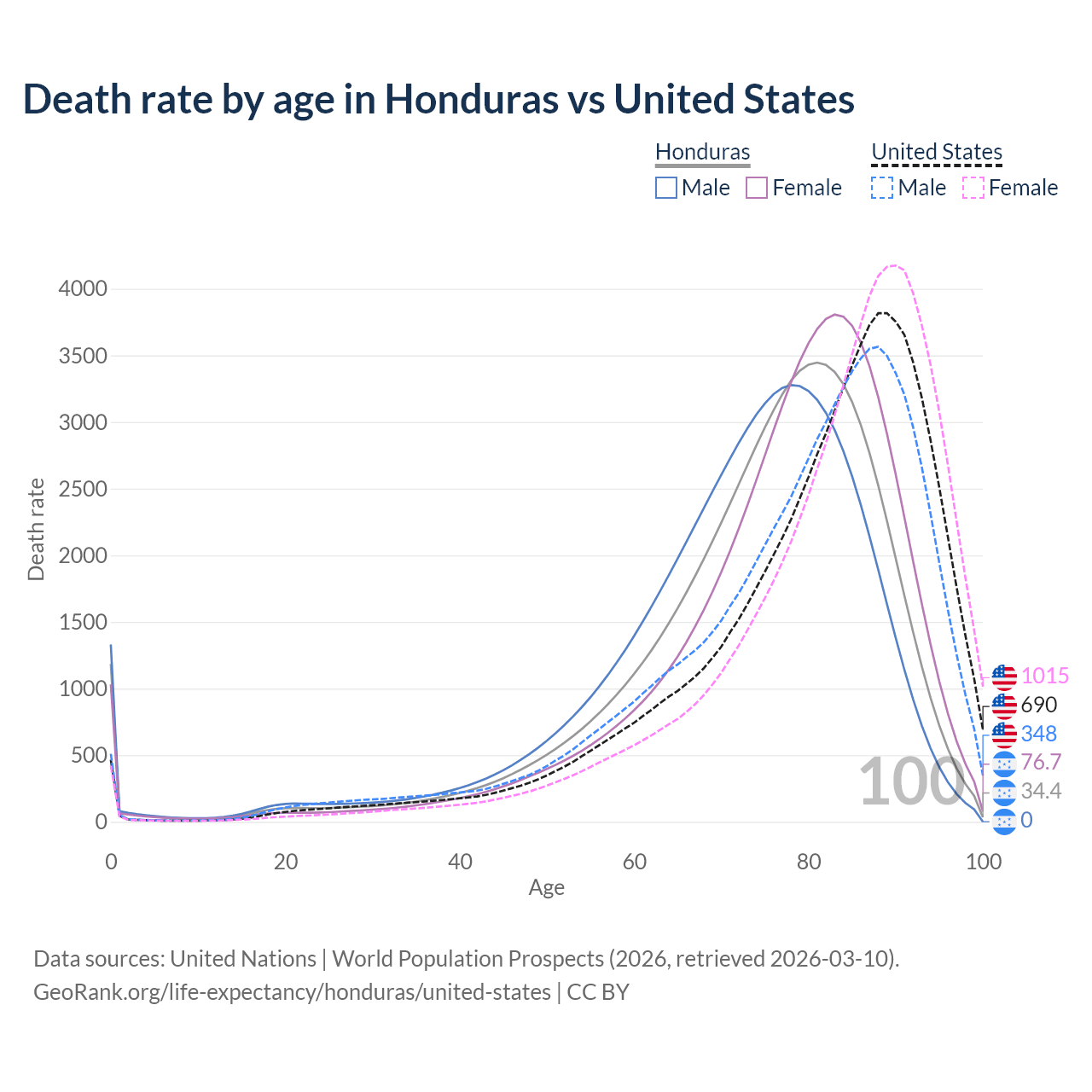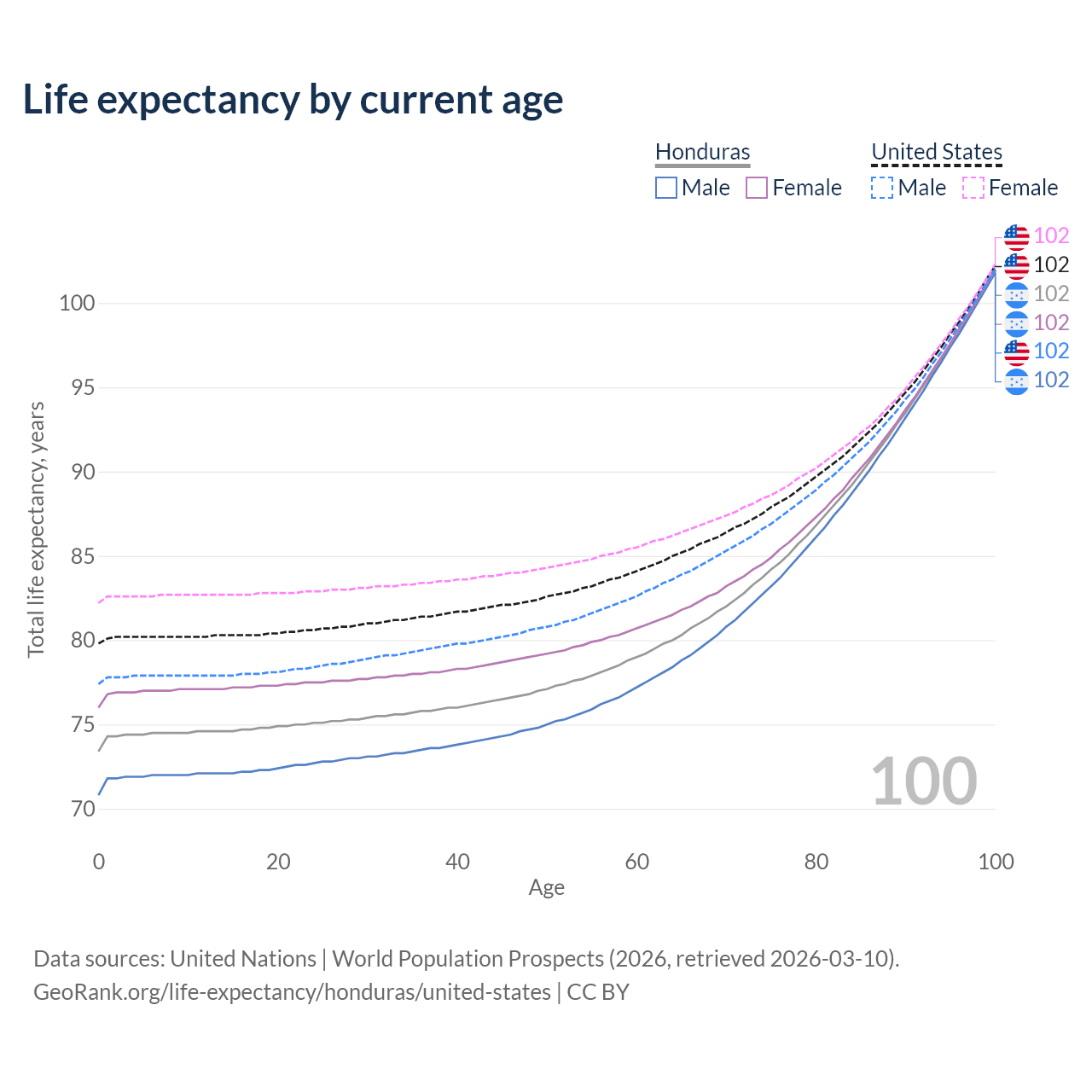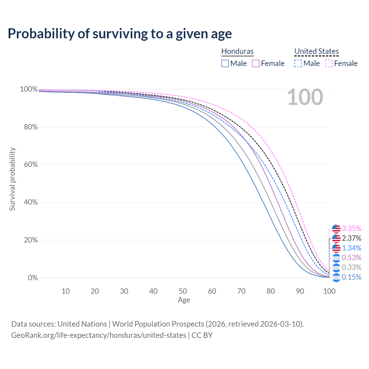 This life expectancy calculator shows the odds of living to 100, 95, 90, and below based on current age for both males and females in Honduras and the United States, along with mean and median age of death. The calculations are based on the 2026 life tables (actuarial tables) from the UN World Population Prospects.