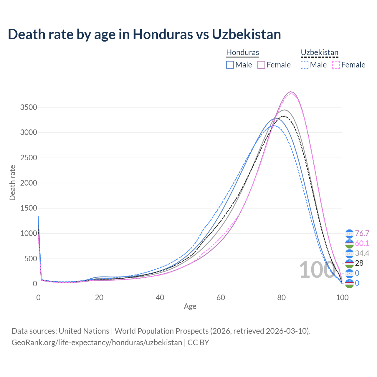 This life expectancy calculator shows the odds of living to 100, 95, 90, and below based on current age for both males and females in Honduras and Uzbekistan, along with mean and median age of death. The calculations are based on the 2026 life tables (actuarial tables) from the UN World Population Prospects.