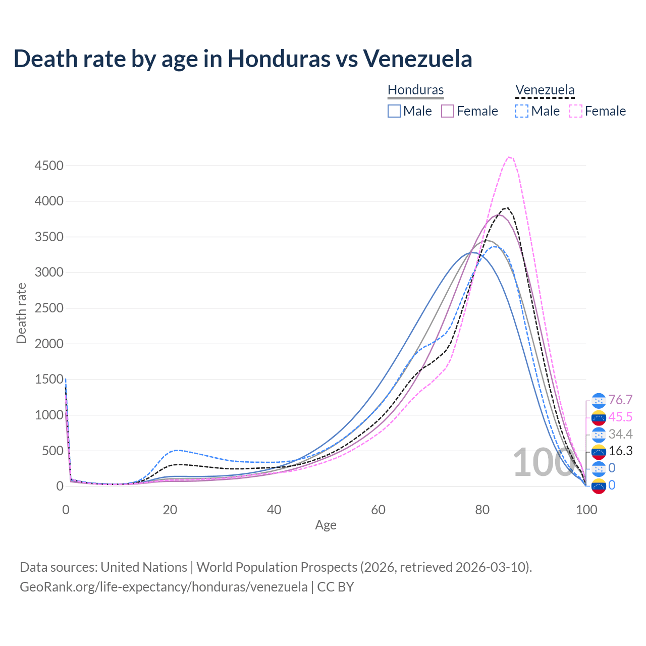 In Honduras, the most common age of death is 81, compared to 85 in Venezuela. The median age of death is 77.1 in Honduras and 79 in Venezuela, meaning only half of each cohort is expected to live past that age.