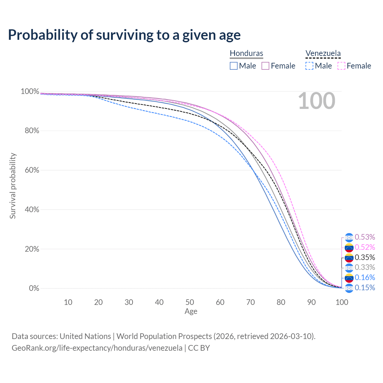 This life expectancy calculator shows the odds of living to 100, 95, 90, and below based on current age for both males and females in Honduras and Venezuela, along with mean and median age of death. The calculations are based on the 2026 life tables (actuarial tables) from the UN World Population Prospects.