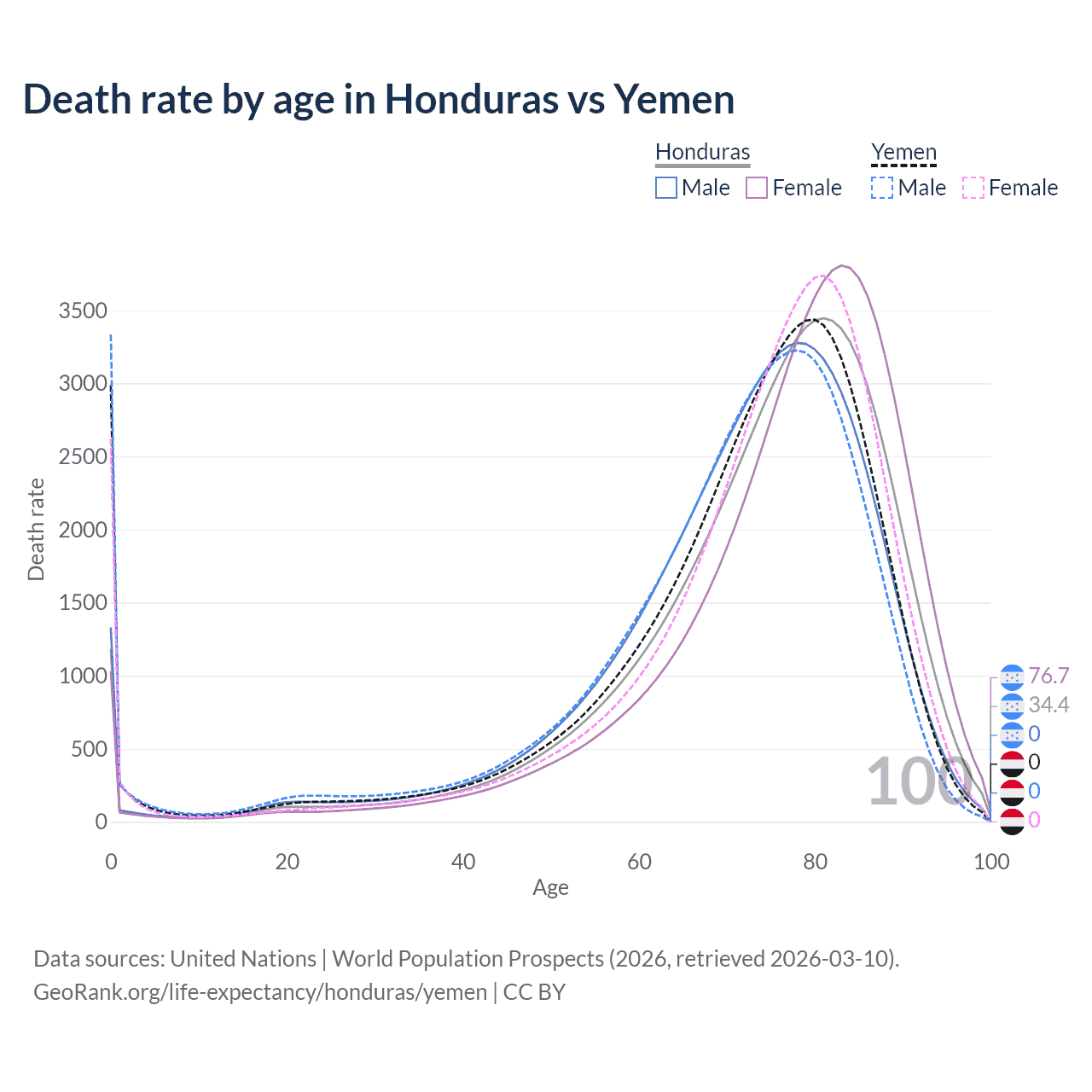 In Honduras, the most common age of death is 81, compared to 80 in Yemen. The median age of death is 77.1 in Honduras and 74.9 in Yemen, meaning only half of each cohort is expected to live past that age.