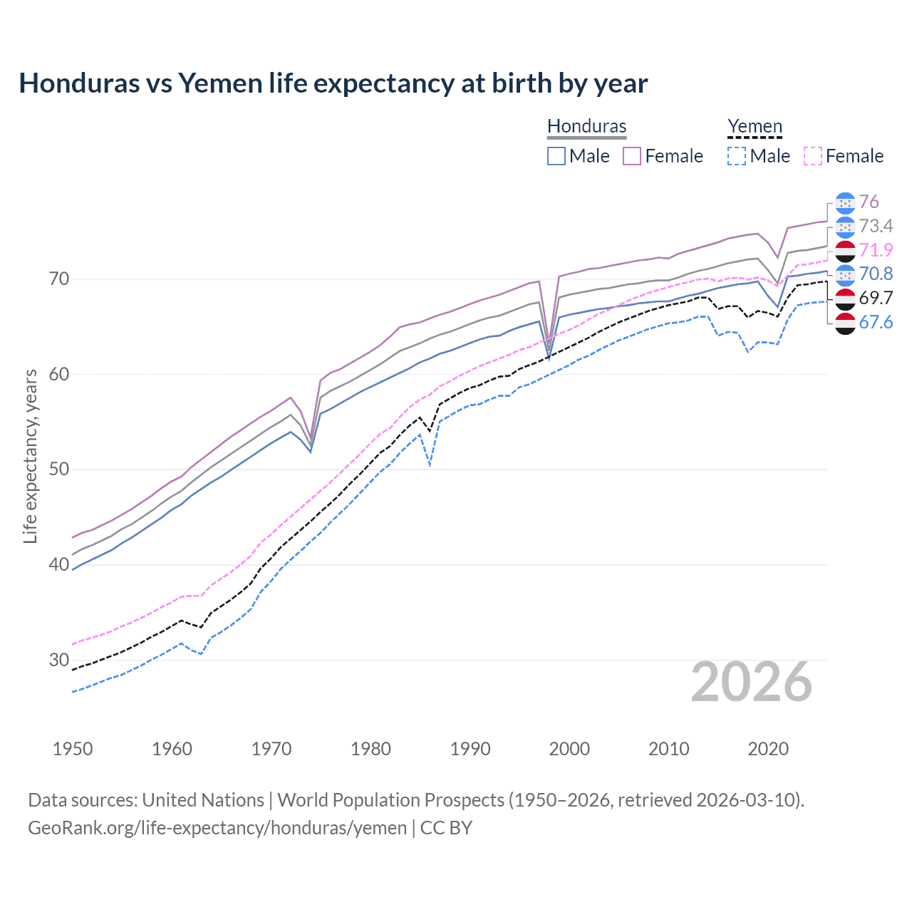 The average life expectancy at birth is 73.4 years in Honduras vs 69.7 in Yemen. Honduras is ranked 110/197 by life expectancy, and Yemen is 138/197. In Honduras, the life expectancy is 70.8 years for males and 76 years for females. In Yemen, it's 67.6 years for males and 71.9 years for females.