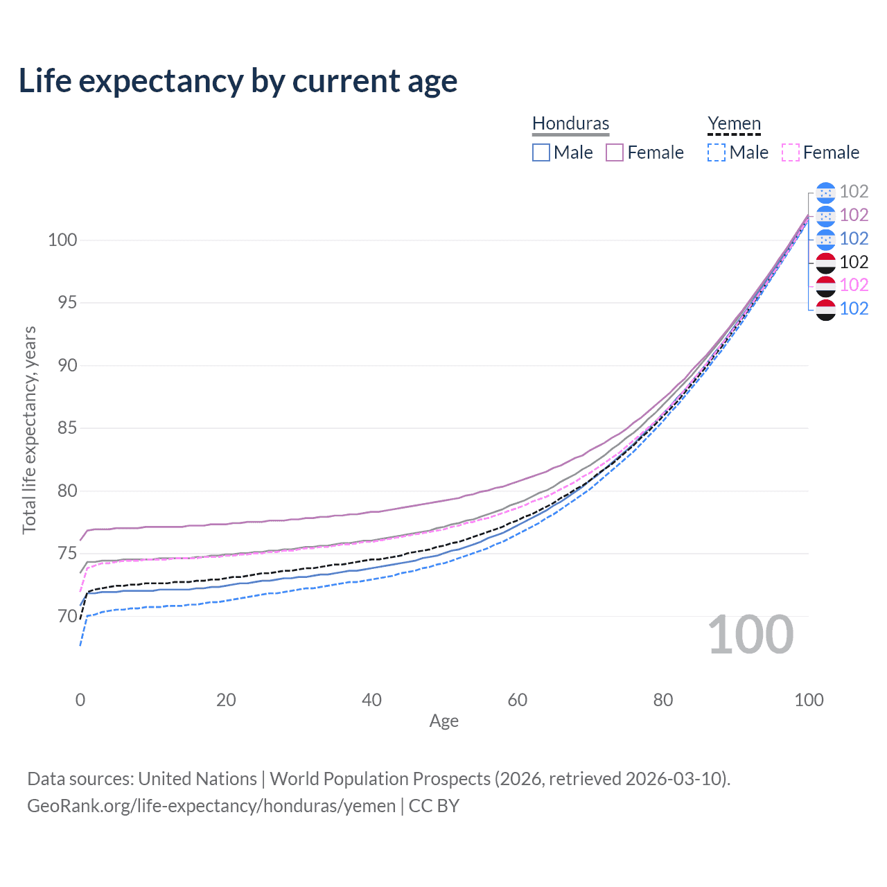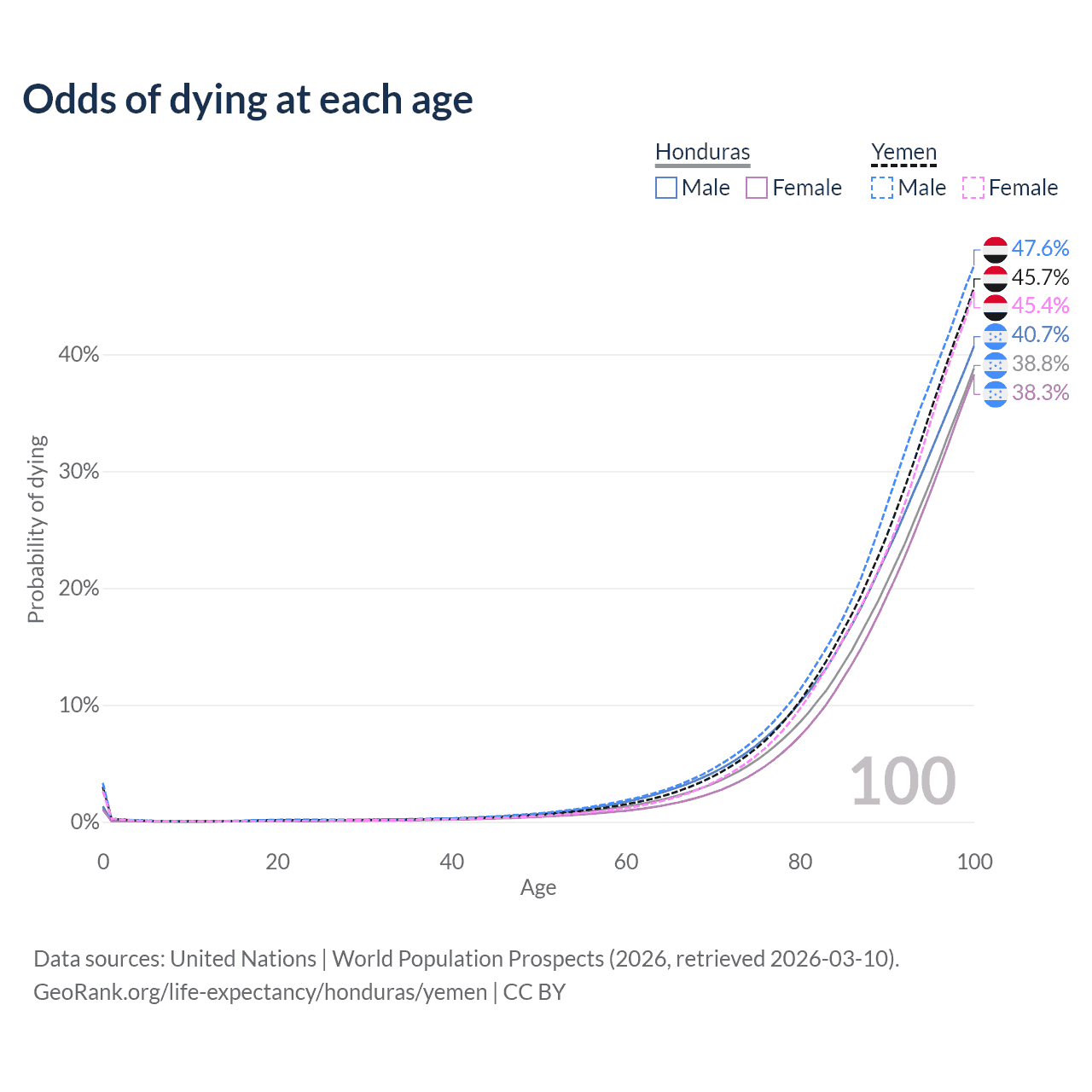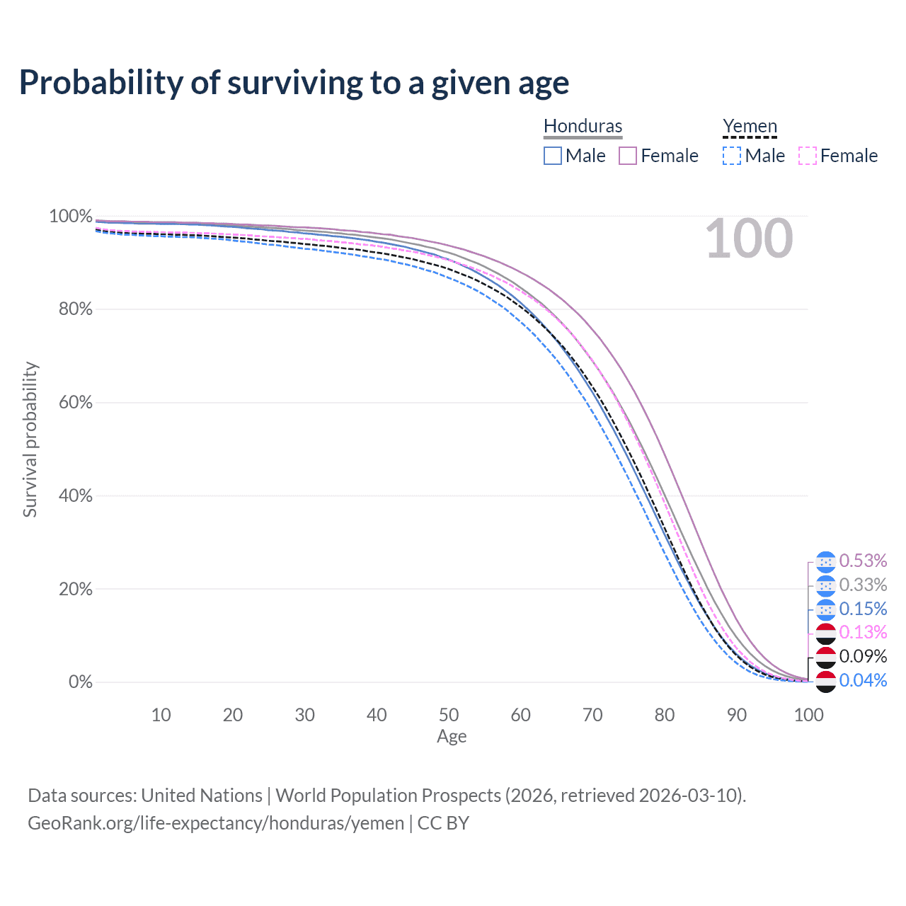 This life expectancy calculator shows the odds of living to 100, 95, 90, and below based on current age for both males and females in Honduras and Yemen, along with mean and median age of death. The calculations are based on the 2026 life tables (actuarial tables) from the UN World Population Prospects.