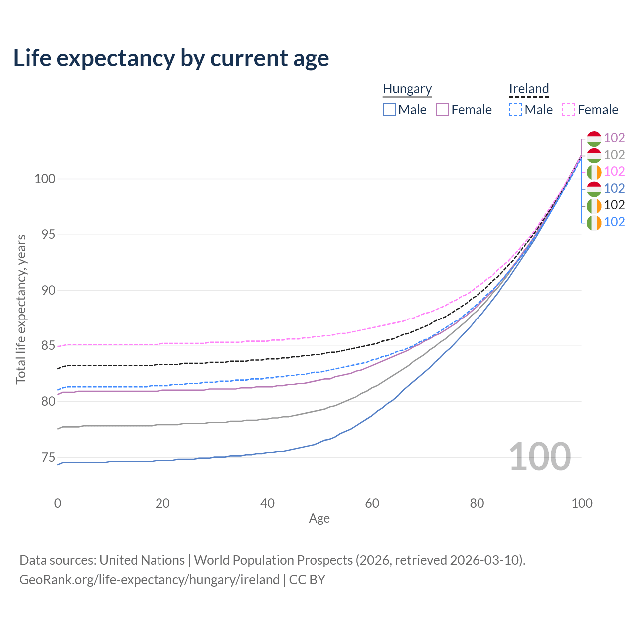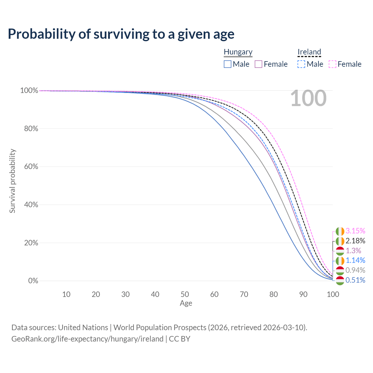 This life expectancy calculator shows the odds of living to 100, 95, 90, and below based on current age for both males and females in Hungary and Ireland, along with mean and median age of death. The calculations are based on the 2026 life tables (actuarial tables) from the UN World Population Prospects.