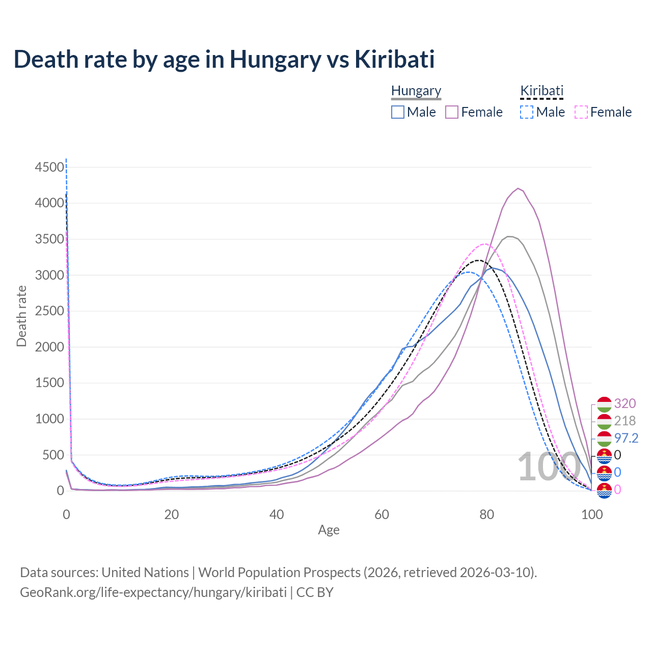 This life expectancy calculator shows the odds of living to 100, 95, 90, and below based on current age for both males and females in Hungary and Kiribati, along with mean and median age of death. The calculations are based on the 2026 life tables (actuarial tables) from the UN World Population Prospects.