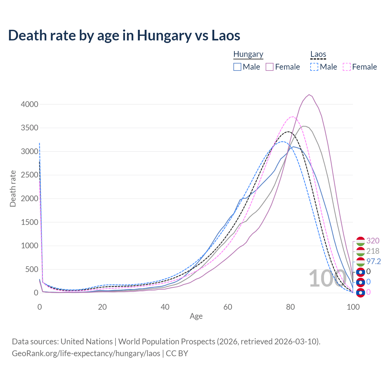 This life expectancy calculator shows the odds of living to 100, 95, 90, and below based on current age for both males and females in Hungary and Laos, along with mean and median age of death. The calculations are based on the 2026 life tables (actuarial tables) from the UN World Population Prospects.