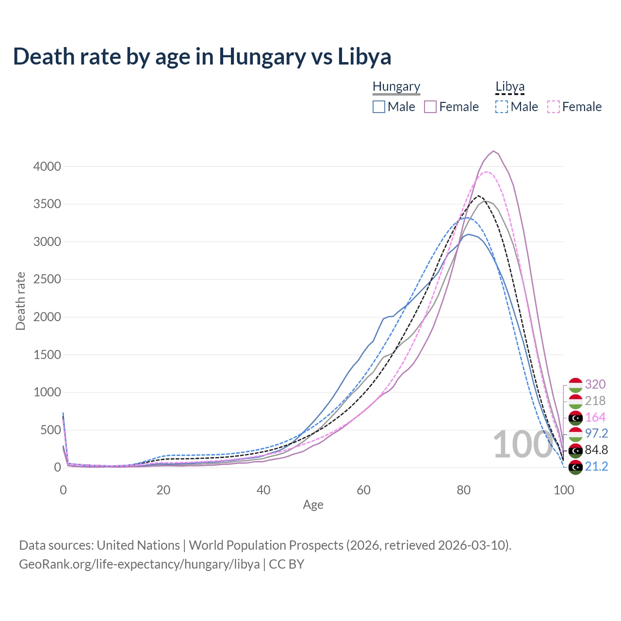 In Hungary, the most common age of death is 84, compared to 83 in Libya. The median age of death is 80.4 in Hungary and 78.8 in Libya, meaning only half of each cohort is expected to live past that age.