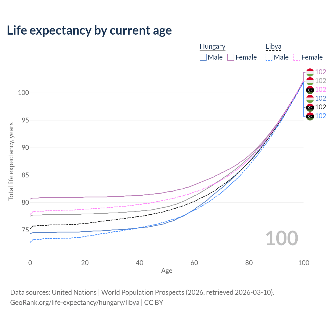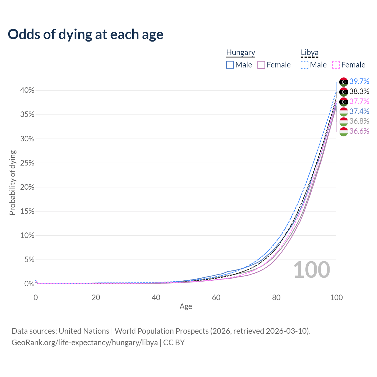 This life expectancy calculator shows the odds of living to 100, 95, 90, and below based on current age for both males and females in Hungary and Libya, along with mean and median age of death. The calculations are based on the 2026 life tables (actuarial tables) from the UN World Population Prospects.