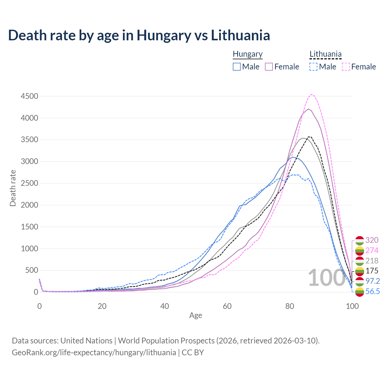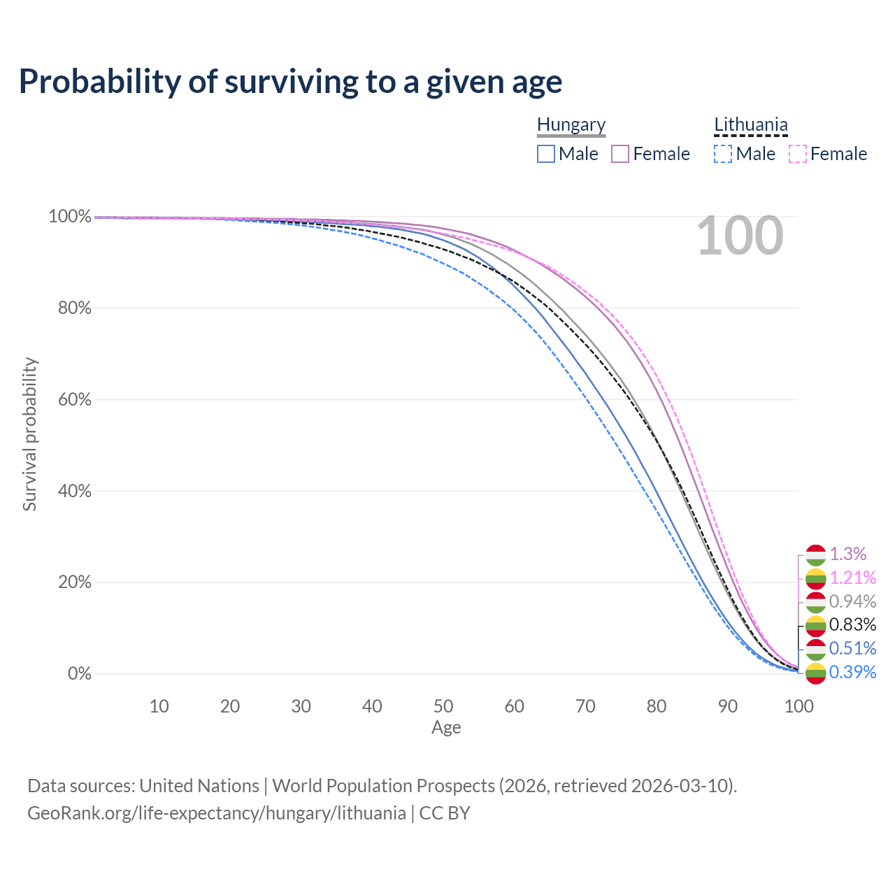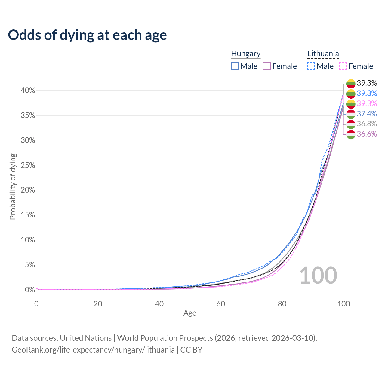 This life expectancy calculator shows the odds of living to 100, 95, 90, and below based on current age for both males and females in Hungary and Lithuania, along with mean and median age of death. The calculations are based on the 2026 life tables (actuarial tables) from the UN World Population Prospects.